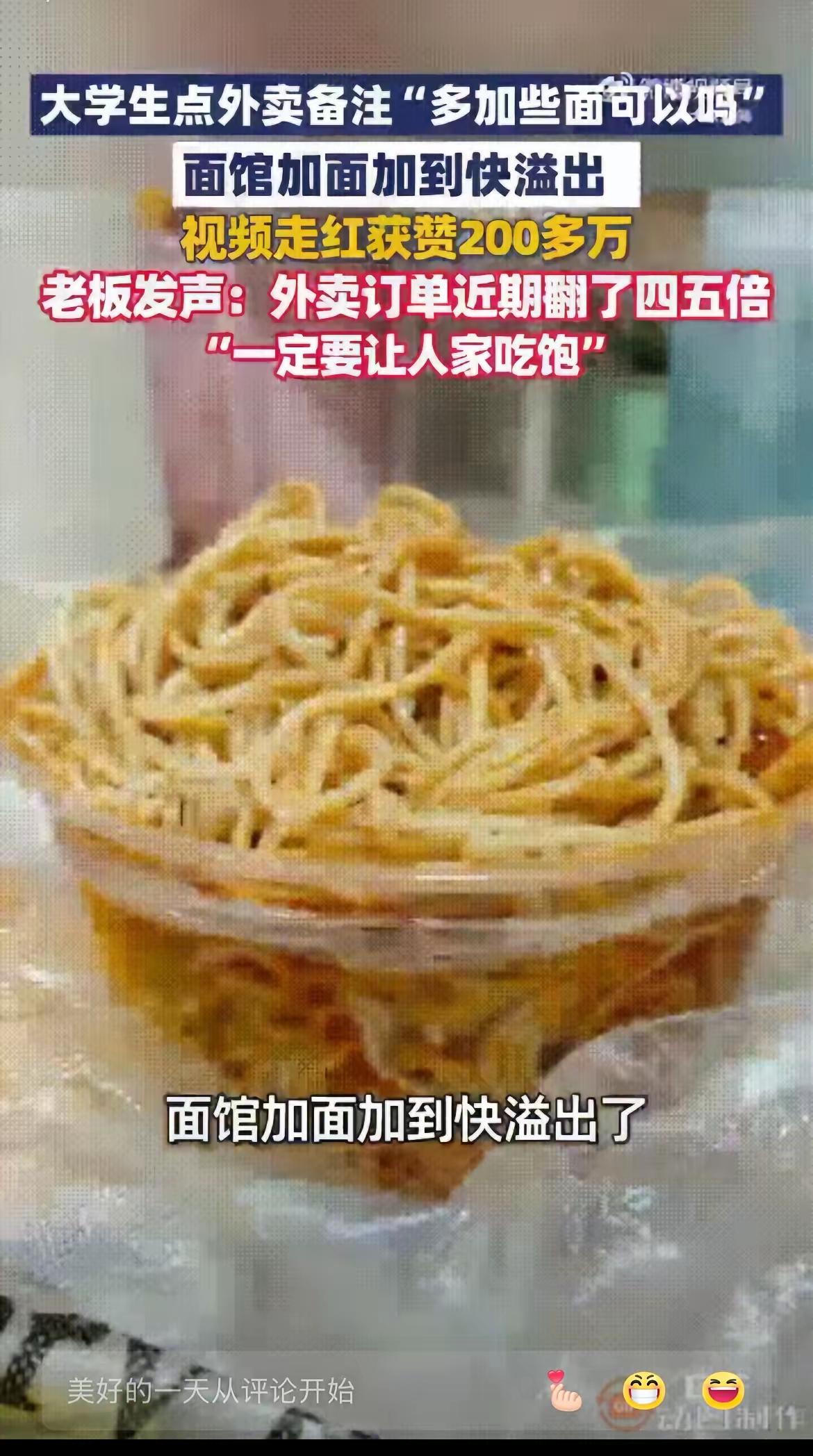 谁能想到,一句小心翼翼的“多加点面”,竟成了戳中无数人的温暖暴击?武汉大学生每月 1200生活费,抠出20块每日饭钱,点最便宜的面时备注改了又改,怕被嫌事儿多、怕被当占便宜,结果拿到手的外卖盒被面撑得盖不上,汤都往外渗,深秋的冷风瞬间就暖了大半。 这哪是多加两把面啊,分明是走过苦日子的老板,一眼看穿了年轻人没说出口的窘迫 四十出头的湖北汉子,想起自己当年读专科时,一顿只敢吃两个馒头就免费面汤,饿到半夜睡不着,所以看见备注就忍不住多添量——面能值几个钱? 总不能让娃吃半饱去上课 没有标准化的算计,没有商业化的套路,这份“超标准”的热乎气,比山珍海味还动人。 现在太多商家把“精准”挂在嘴边,少辣多醋都未必落实,可真正打动人的,从来都是这份不计成本的共情 老板没想着靠这个营销,却让销量暴涨4倍,不是因为面多,是因为大家都馋这份被人接住的妥帖 温暖从来都不是惊天动地的大事,就是有人把你的难处放在心上,顺手搭个台阶。 你有没有被陌生人这样“悄悄关照”过?是加班时老板多给的一份饭,还是赶路时路人递来的一把伞?来评论区说说你的温暖瞬间~