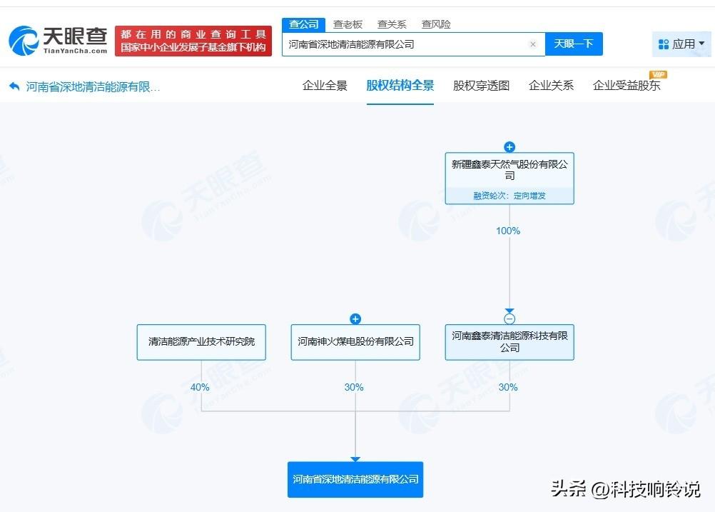 【神火股份、新天然气等在河南成立清洁能源公司 注册资本500万】 天眼查工商信息显示,近日,河南省深地清洁能源有限公司成立,法定代表人为陈永泽,注册资本500万人民币,经营范围包括工程和技术研究和试验发展、基础地质勘查、地质勘查技术服务等。股权全景穿透图显示,该公司由清洁能源产业技术研究院、新天然气(603393)旗下河南鑫泰清洁能源科技有限公司、神火股份(000933)共同持股。 天眼查信息: