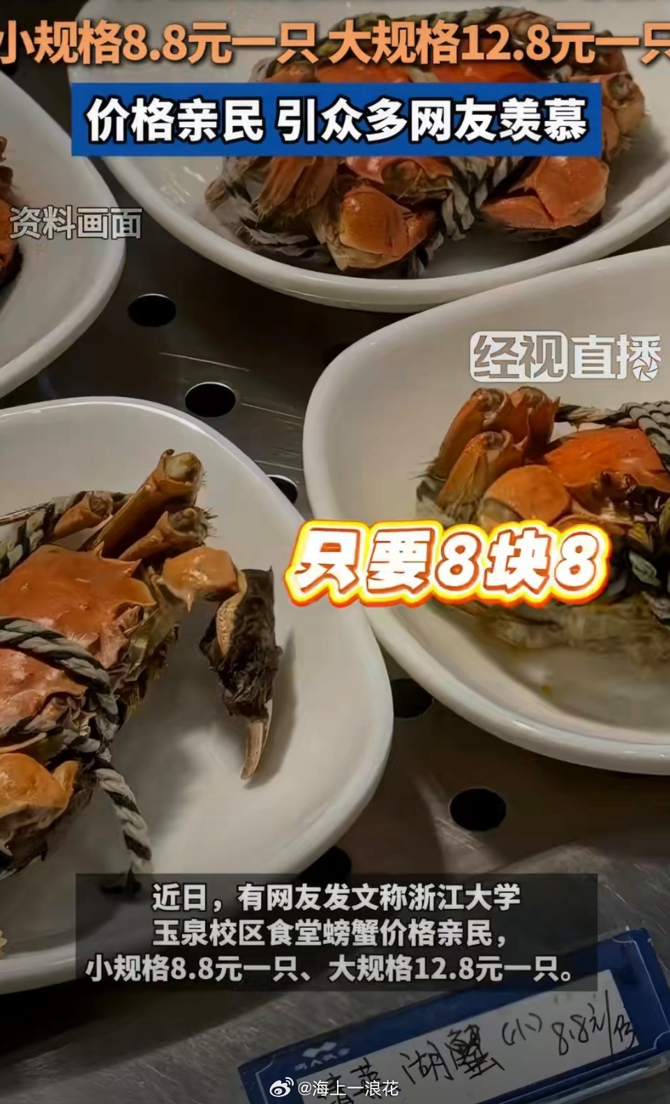 浙大回应食堂一只螃蟹只卖8.8元看视频,里面的大闸蟹个头饱满蟹黄足,清蒸保留原汁原味,性价比超高。学生党轻松实现“大闸蟹自由”,食堂这波操作暖心又实在,必须给后勤点赞! ​​​