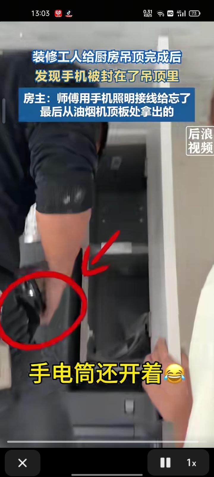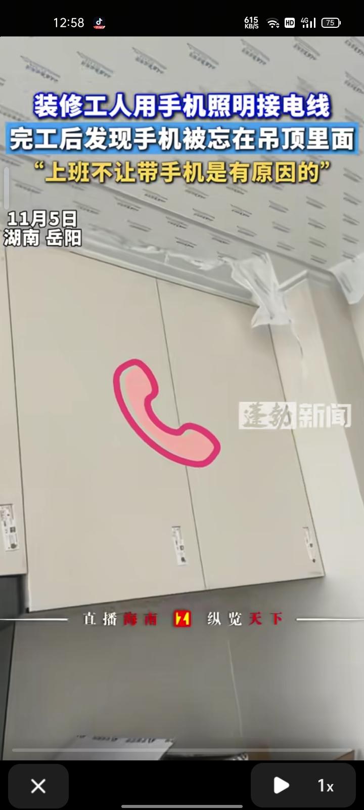 11月4日,湖南岳阳。网友发视频称,装修工人用手机照明接电线,完工后发现手机忘在吊顶里,这要是手机调成静音,还真找不到。好在橱柜油烟机的顶板没有封,就拿个棍子在这里戳,师傅在另一边用手推,经过不懈努力,终于把手机拿出来了,手电筒还开着