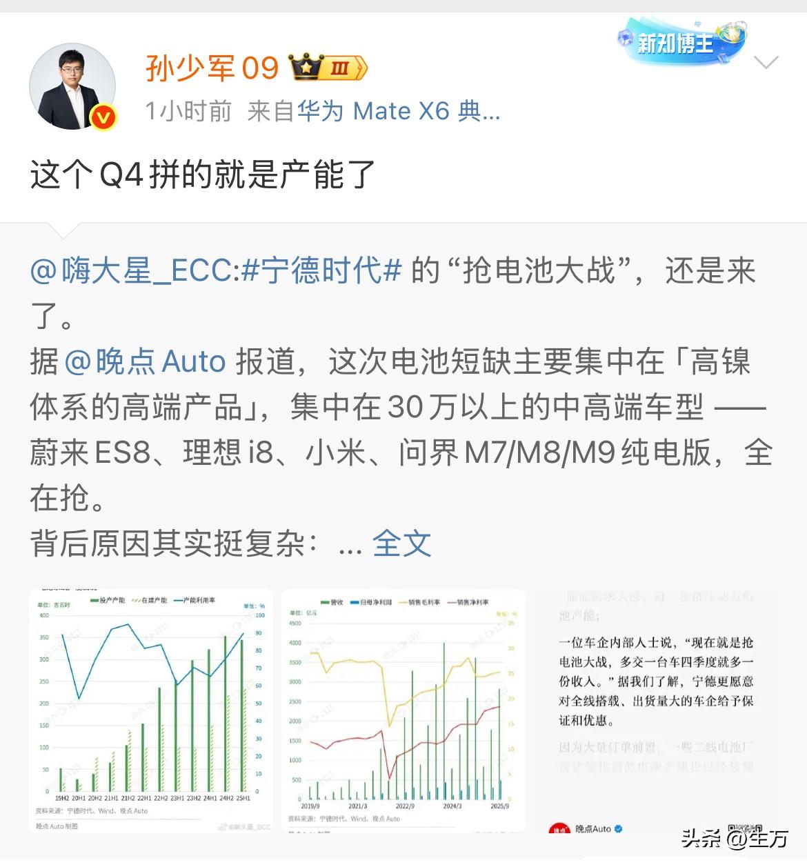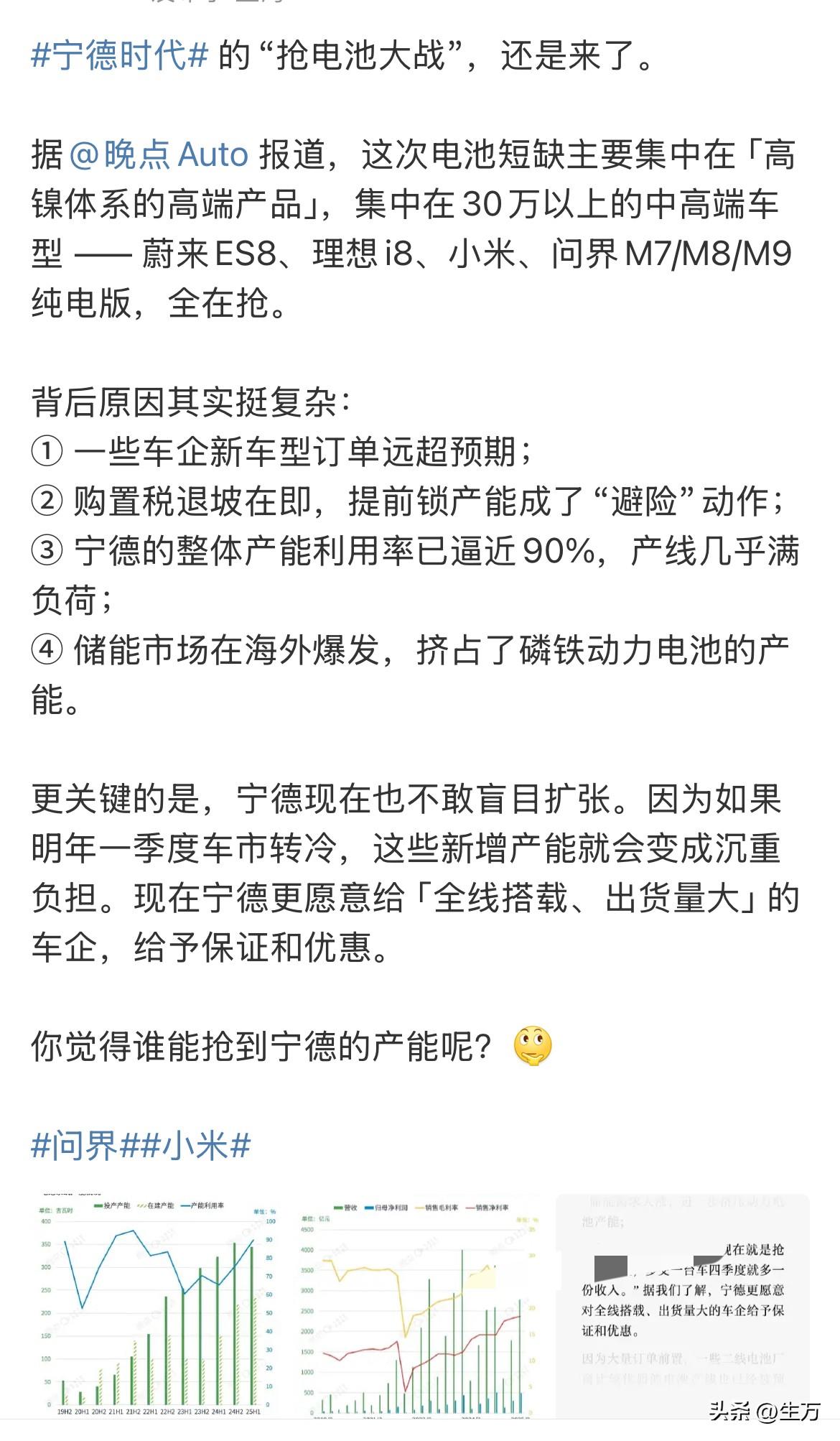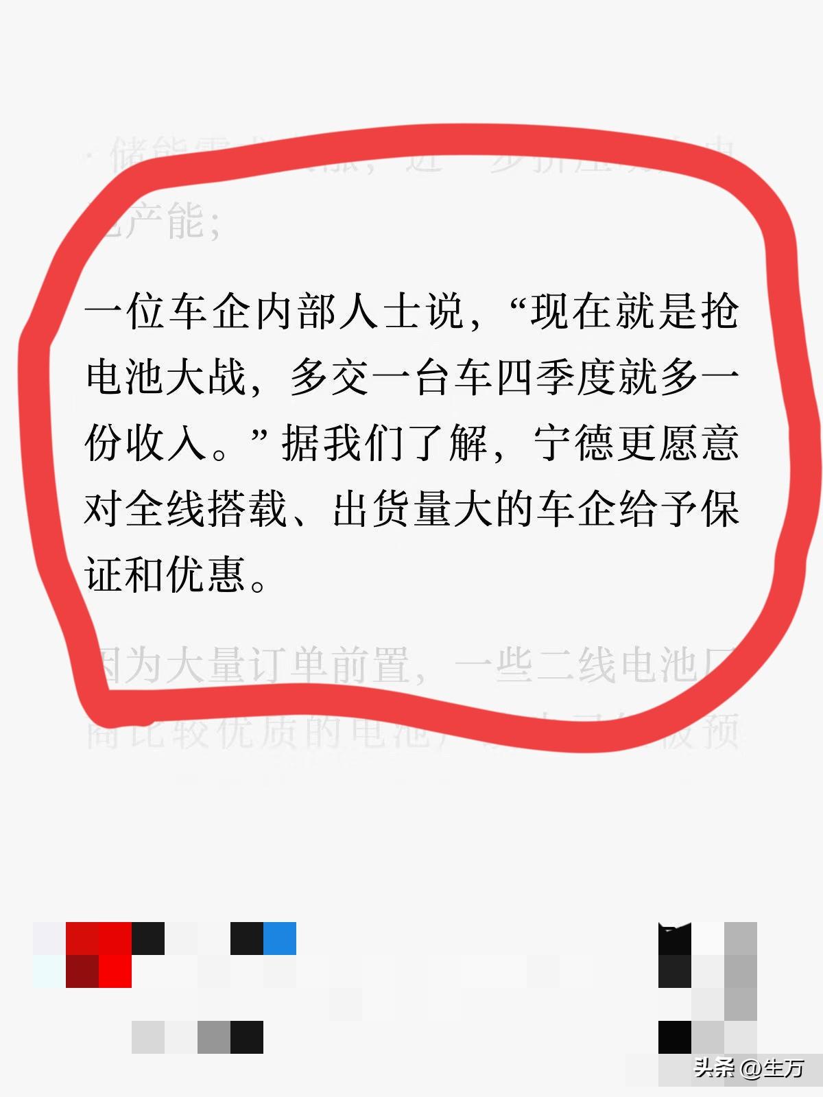 孙少军:为了第四季度的成绩,各个车企拼了! 没想到,现在稍微高端一点的电动车,抢电池都已经到了这种地步了! 就是他们对这些电池的要求更高,所以相对来说产能更加的紧张! 因此,各个品牌基本上都是驻扎在厂里面,时时刻刻盯着生产线,因为烧不留神,可能就会被对手把订单给抢走了[捂脸] 因为大家都是用的一种电池,而且都是属于自己品牌下的高端车型,有点像在厨房里面,客户都盯着厨子做饭一样,虽然大家都在排号,谁也不能够确定有人会插队抢单! 而这些顾客他们身上背负的就是第四季度的任务,所以现在宁德时代就是这个厨子,谁也不敢得罪,但是每个顾客的脾气不一样,实力也不一样,不排除某个顾客可能会用一些非常规的方法,插队抢到自己的单子,这你受得了吗?