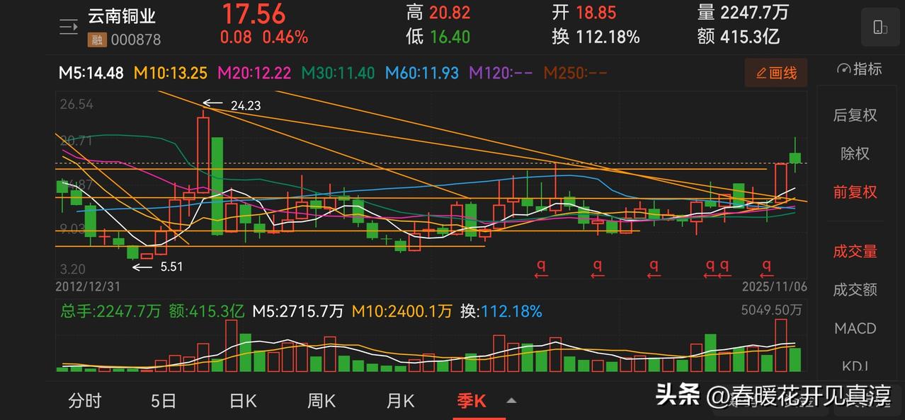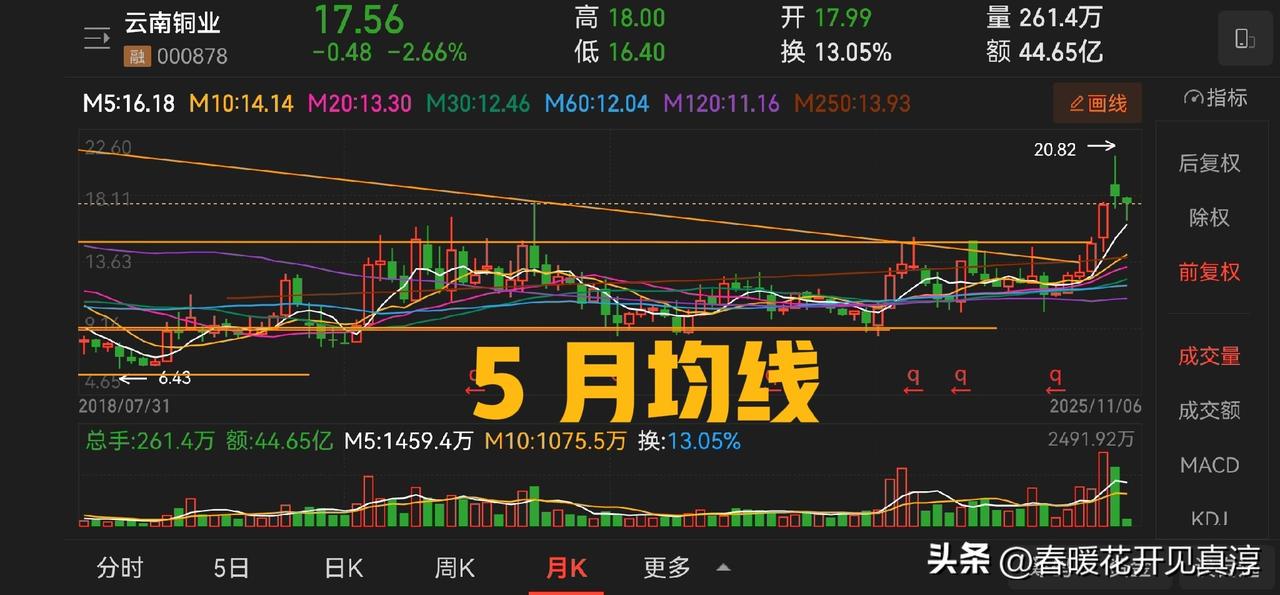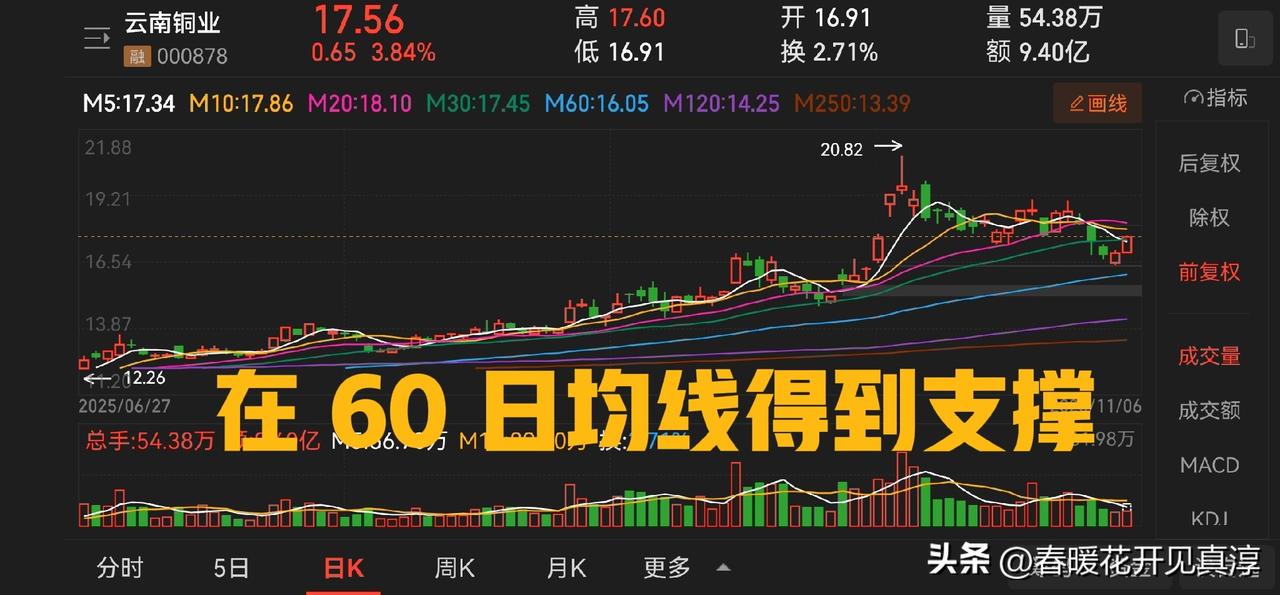 云南铜业在60日均线处得到支撑,短期的调整或许已经到位。云南铜业三季报业绩带来的冲击应该已经过去,看好股票未来走势。 相比较其他的同行业的股票,云南铜业这次调整相对幅度要深一些,来到了60日均线附近,主要原因应该是和三季度报告利润增速有比较大的关系,但是云南铜业同时有200多亿的存货,这个因素是很多人所没有考虑的。总的来说,铜应该是看涨的资产,这个和人工智能有关,和新能源汽车也有关,大的来说就是和电子消费有关系。 它和稀土还有一点不同,稀土现在是价格上涨,但是销量在萎缩,就是说稀土短期的量上不去。但是呢,相关股票的估值已经拉的比较高了。这个就是我在现阶段相对不太看好北方稀土的原因。 江西铜业是非常优秀的资产,但是云南铜业相比江西铜业,还有一个资产注入的概念,这个在未来发展股权财政的背景下是有可能加速的。