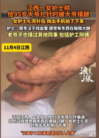 江西,一个女护士,正在给一个95岁的大爷扎针,她认真寻找大爷的血管,却感觉大腿有东西在动来动去,她害怕伤着大爷了,坚持给大爷扎完针才看大腿,结果看到了不可思议的一幕,大爷竟然用手指触碰她的大腿,女护士拍了视频,给其他女同事和护工阿姨看,结果她们也被大爷摸了。 回想起这一幕,这个女护士感到非常的震惊,不但是她,就连她的女同事和护工阿姨,都难以置信,一个95岁的老头子,怎么还会有这心思。 当时的情况是,这个大爷就要扎针了,正好是这位女护士来帮忙扎针。 扎针就得找血管,大爷毕竟95岁了,皮肤有褶皱,有老年斑,护士寻找血管就有些困难。 好在这个女护士凭借丰富的经验,在她的一翻仔细观察下,还是找到了血管,当她想扎针时,她就感觉到,自己的大腿有东西动来动去,似有似无的。 女护士以为有虫子爬进去了,因为是扎针的关键时期,她害怕自己一个不小心就扎偏了,大爷年龄这么大了,她容不得有错,她只能仔细地扎针,眼睛不敢离开扎针的地方。 终于她扎针成功了,她的大腿似乎还有东西动来动去,她这才有时间看一下自己的大腿,结果就看到了让她不可思议的一幕。 只见大爷正在用手指,似有似无地摸着她的大腿,大爷并没有意识到女护士已经扎完针了,他专注于看女护士的大腿,想着怎么摸。 女护士看到这一幕,虽然心里很不舒服,但她不动了声色,偷偷掏出手机,将这一幕拍了下来。 她拍到的画面是,老人只是拿手指似有似无地在触碰她,这好像也不是特别大的事情,更何况老人年纪大了,她也不想因为这点事就大动干戈,如果因为这件事把老人给气倒了,估计她有数不清的麻烦。 但离开了老爷子,女护士想起这件事,内心就非常难受,她是一名护士,却在工作的时候,被男病人骚扰,这实在让她难以接受。 可这件事说出来,又有谁会信呢!毕竟对方是一个95岁的老爷子,说出来,可能别人还会觉得她小题大做。 可她越想这件事情,内心越难受,不说出来,她感觉自己难以安心工作。 于是她拿出自己拍的视频,给女同事们看,毕竟不少女同事也给这个大爷扎过针。 结果她们一看,都愤怒了,原来她们都被这个老头子摸过,就连护工阿姨过来看了,都愤怒地说自己也被摸过。 大家并没有因为老头子的年龄大,而忽视自己被摸的感受,她们只觉得这么大年龄的老头子,居然还会干这种事,她们无法做到视而不见。 其实不管这个老爷子年龄有多大,他都是一名男子,老头子在女护士们和护工阿姨工作的时候,趁机骚扰她们,触摸她们,这都令人难以接受。 她们同样想不明白,都已经95岁了,还生病了,这老爷子怎么还会有这个心思。 在大家的意识中,人到了一定的年纪,应该明白,什么可以做什么可以不做,特别是在生病的时候,更应该懂得,珍惜生活的美好。 这个95岁的老爷子倒好,或许他正利用自己年龄大,所以为所欲为,反正别人也不会拿他怎么样。 事实真是如此吗? 女护士们遇到这样的事,难道就应该睁一只眼闭一只眼吗? 当然不是,不管老爷子年龄有多大,只要他骚扰了女子,女子就可以要求他承担相应的责任。 1、 老爷子在女护士们和护工阿姨们工作的时候,进行身体触摸,他的行为已经构成了猥亵行为。 《治安管理处罚法》第44条规定:猥亵他人的,或者在公共场所故意裸露身体,情节恶劣的,处5日以上10日以下拘留;猥亵智力残疾人、精神病人、不满14周岁的人或者有其他严重情节的,处10日以上15日以下拘留。 虽然法律上规定,年满70周岁的老人,如果违反了治安管理处罚法的规定,可以免予处罚,但他的行为将会受到他人的谴责。 2、 即使老爷子免予行政处罚,但他的行为给女护士们和护工阿姨造成精神伤害,她们可以要求精神赔偿。 《民法典》第1183条规定:侵害自然人人身权益造成严重精神损害的,被侵权人有权请求精神损害赔偿。 因故意或者重大过失侵害自然人具有人身意义的特定物造成严重精神损害的,被侵权人有权请求精神损害赔偿。 毕竟不能因为老爷子年龄大,就让他为所欲为。 那么,你对这个95岁的老人有何看法呢?来源:浪涨新闻 2025年11月6日