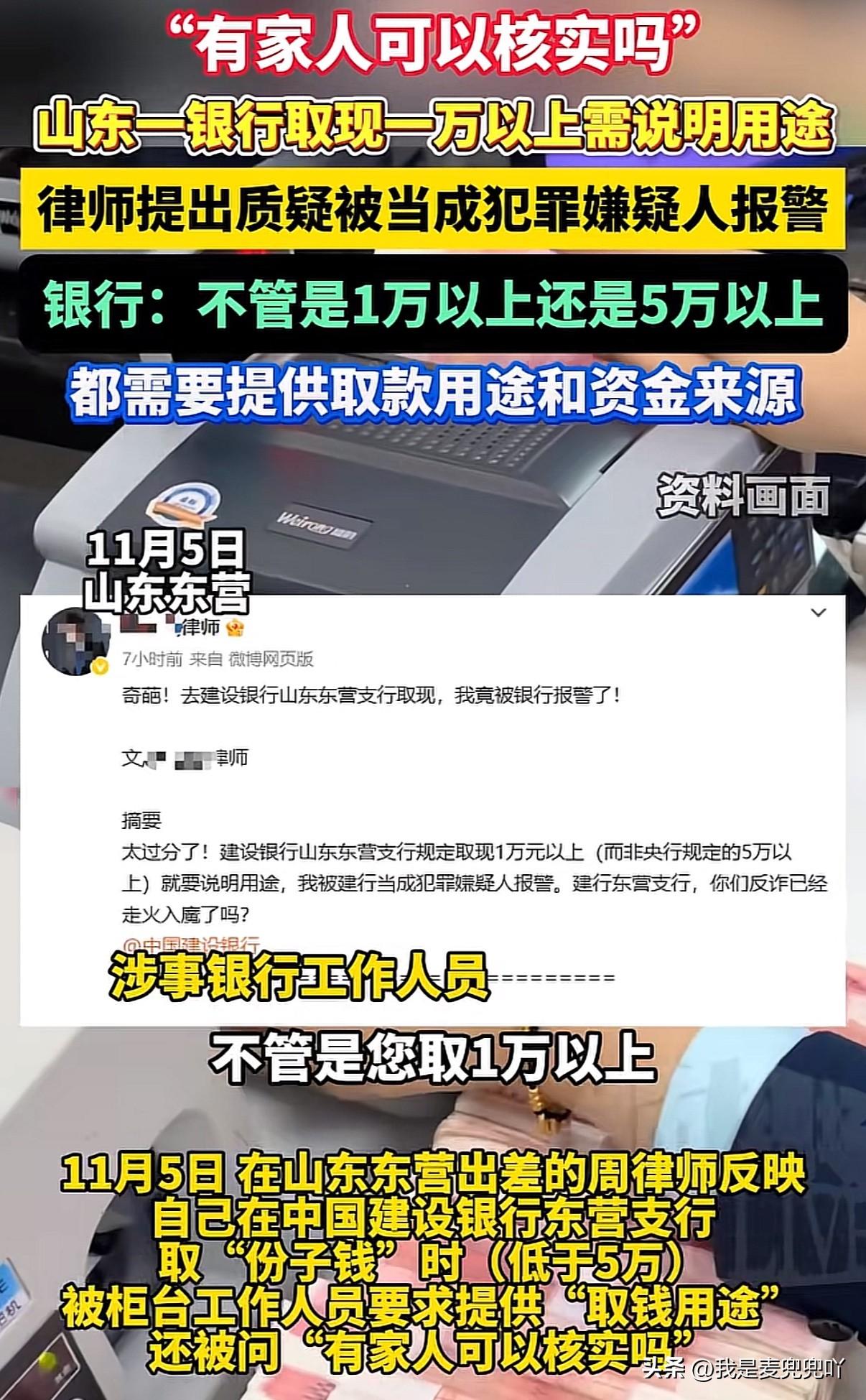 律师发文称去银行取钱不仅被盘问取钱用途?上个月xxx为什么给你转钱?竟被银行当成犯罪嫌疑人报警 11月5号周律师发文表示去山东东营一建行网点取钱,柜员不停盘问取钱做什么,还问他上个月xxx为什么给他转钱,由于周律师没有配合回答这些明显侵犯个人隐私的问题被银行报警 对此银行回应称取一万以上都必须说明用途这是执行反诈中心的规定,别人的转账也要说明来源是因为什么转账给你目的都是为了预防诈骗 周律师表示,银行的行为是默认储户都是嫌疑人侵犯个人隐私,此举违背法理。反诈已经到了走火入魔的地步连基本的法律常识都没有了 大家取钱有遇到过问为什么要取钱的经历吗
