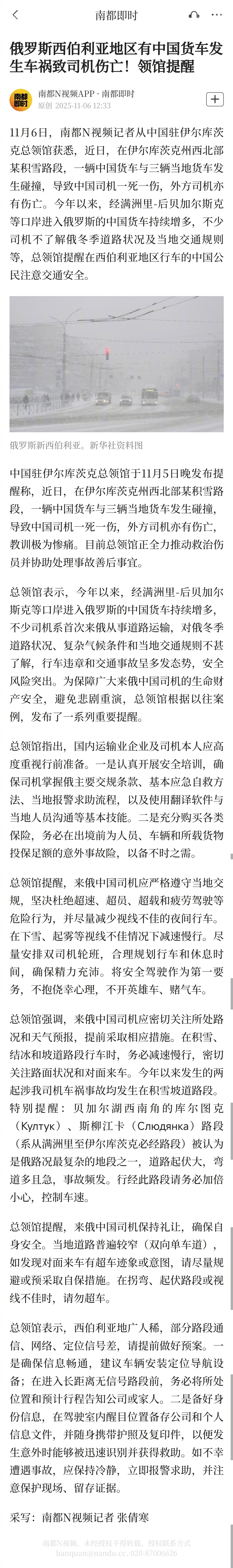 #领馆回应俄罗斯车祸致中国司机伤亡#【俄罗斯西伯利亚地区有中国货车发生车祸致司机伤亡!领馆提醒】#俄罗斯车祸致中国司机一死一伤#11月6日,南都N视频记者从中国驻伊尔库茨克总领馆获悉,近日,在伊尔库茨克州西北部某积雪路段,一辆中国货车与三辆当地货车发生碰撞,导致中国司机一死一伤,外方司机亦有伤亡。今年以来,经满洲里-后贝加尔斯克等口岸进入俄罗斯的中国货车持续增多,不少司机不了解俄冬季道路状况及当地交通规则等,总领馆提醒在西伯利亚地区行车的中国公民注意交通安全。