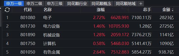 板块量能上,电子回暖重夺第一,以机器人为首的机械冲进前三。