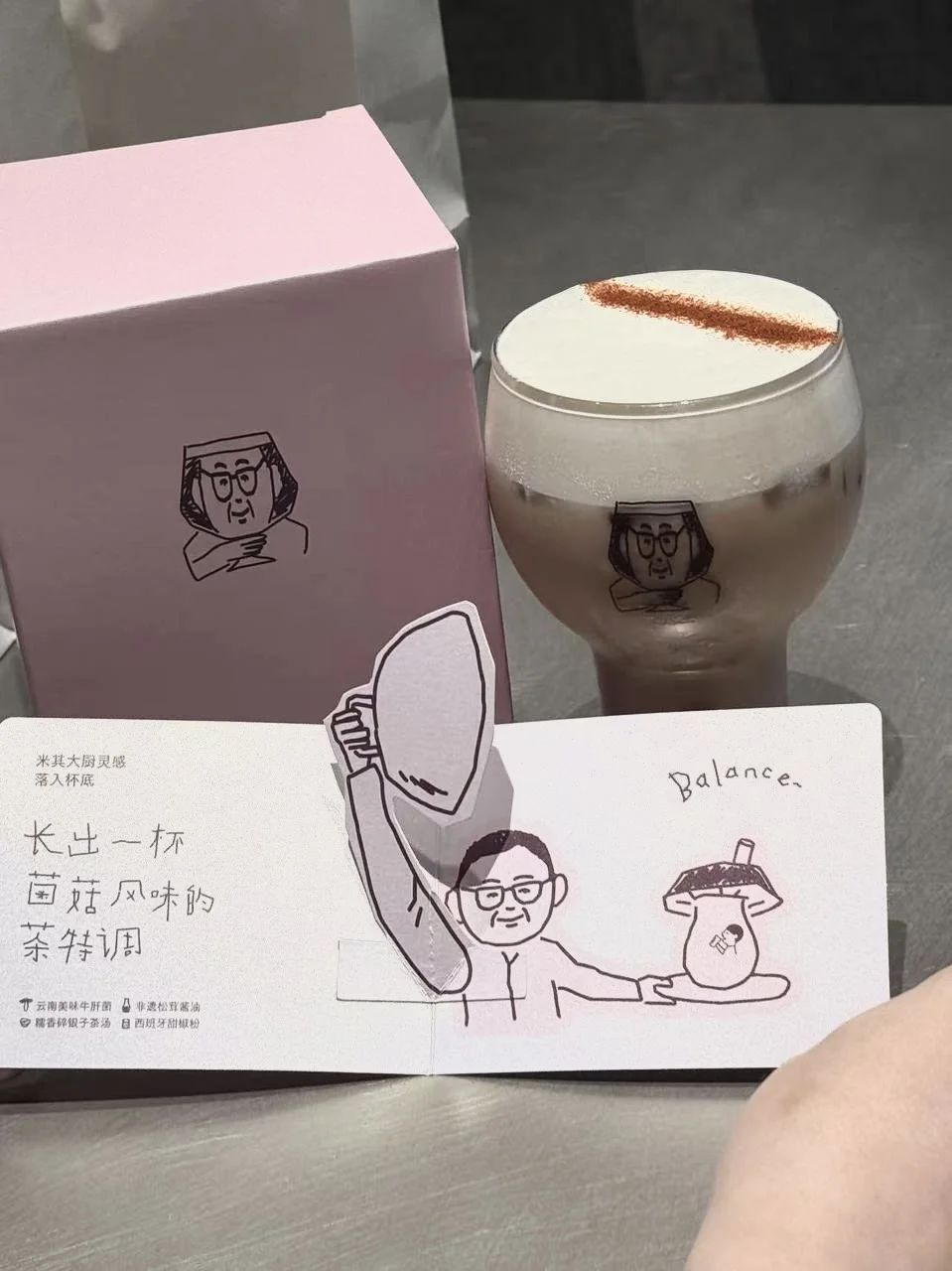 对了,这次设计挺有新意的,杯套是撕拉出q版“大厨送茶”,完全手动大厨上班hhhhh,我个人比较喜欢玻璃杯,喜茶现场就能装上新品碰杯,几百的特调还喝不到米其林级别的牛肝菌捏!!