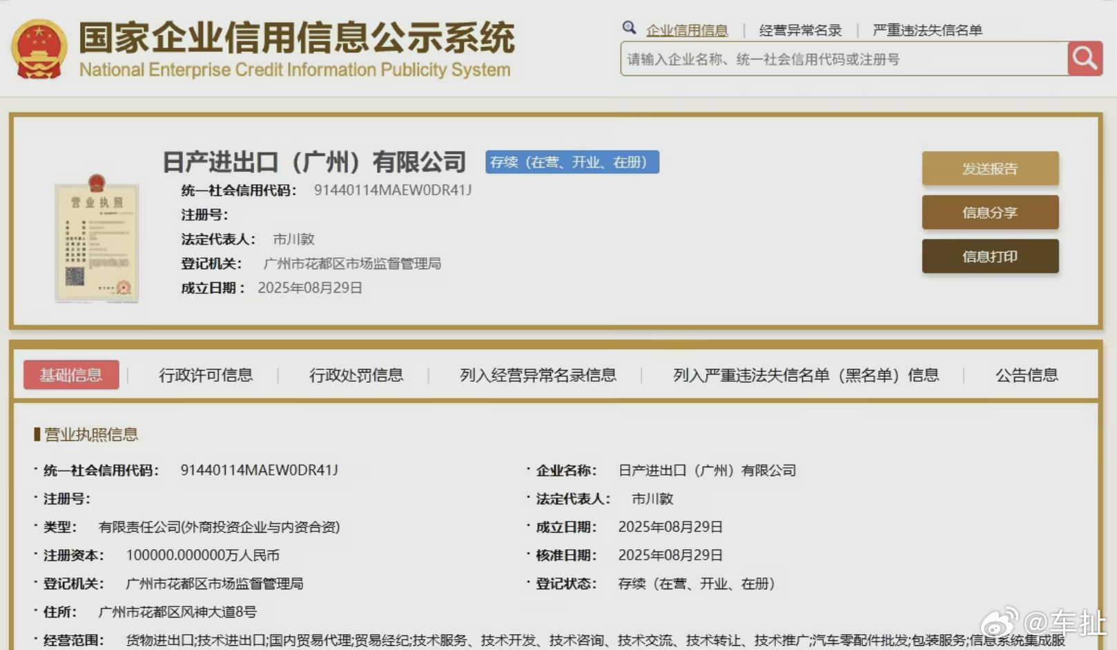 11 月 6 日,第八届中国国际进口博览会上,日产汽车正式宣布日产进出口(广州)有限公司成立。这是外资汽车企业在华设立的首家合资整车进出口公司,注册资本 10 亿元,由日产中国投资公司认缴 6 亿元、东风汽车集团认缴 4 亿元。东风日产 N7 与锋坦 Frontier Pro PHEV 将作为首批中国本土开发车型,通过该公司出口海外市场。