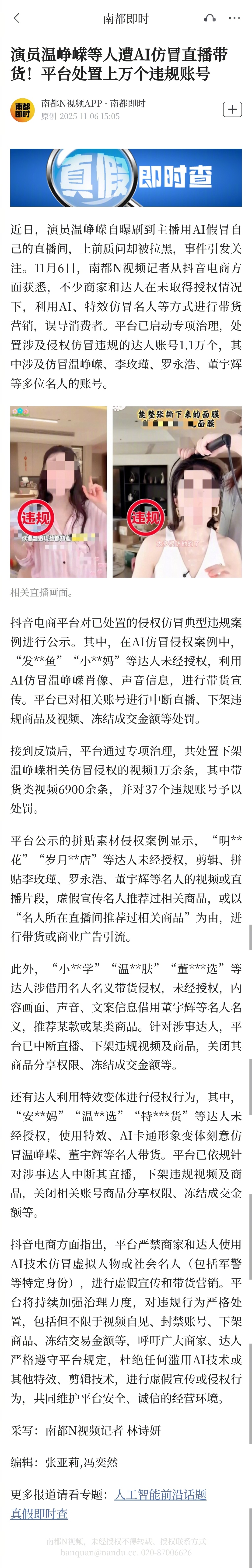#演员温峥嵘遭AI仿冒直播带货#【演员温峥嵘等人遭AI仿冒直播带货!平台处置上万个违规账号】#AI仿冒名人带货上万账号被处置#近日,演员温峥嵘自曝刷到主播用AI假冒自己的直播间,上前质问却被拉黑,事件引发关注。11月6日,南都N视频记者从抖音电商方面获悉,不少商家和达人在未取得授权情况下,利用AI、特效仿冒名人等方式进行带货营销,误导消费者。平台已启动专项治理,处置涉及侵权仿冒违规的达人账号1.1万个,其中涉及仿冒温峥嵘、李玫瑾、罗永浩、董宇辉等多位名人的账号。
