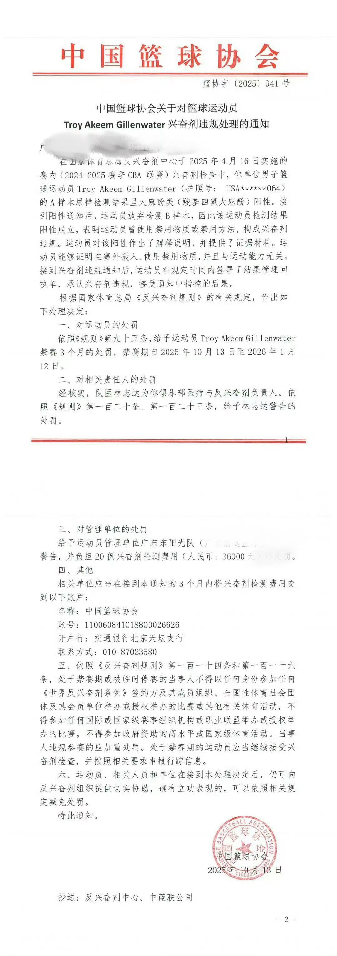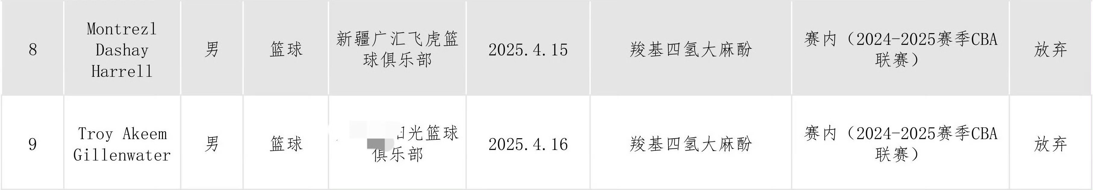 CBA联赛中xx队外援吉伦沃特和新疆队外援哈雷尔在季后赛期间兴奋剂违规!(图一)