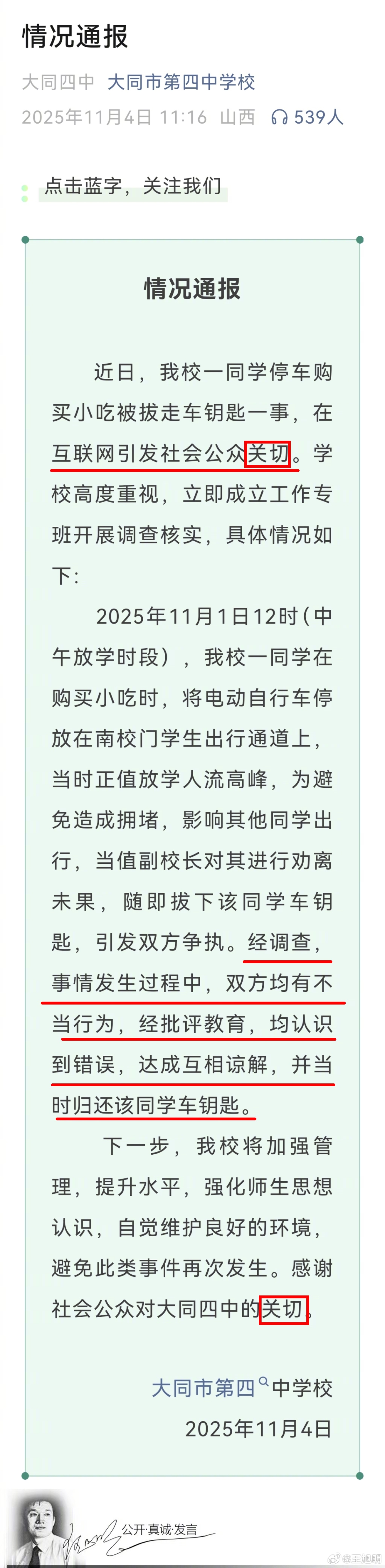 2025年11月1日12时(中午放学时段),我校一同学在购买小吃时,将电动自行车停放在南校门学生出行通道上,当时正值放学人流高峰,为避免造成拥堵,影响其他同学出行,当值副校长对其进行劝离未果,随即拔下该同学车钥匙,引发双方争执。经调查,事情发生过程中,双方均有不当行为,经批评教育,均认识到错误,达成互相谅解,并当时归还该同学车钥匙。