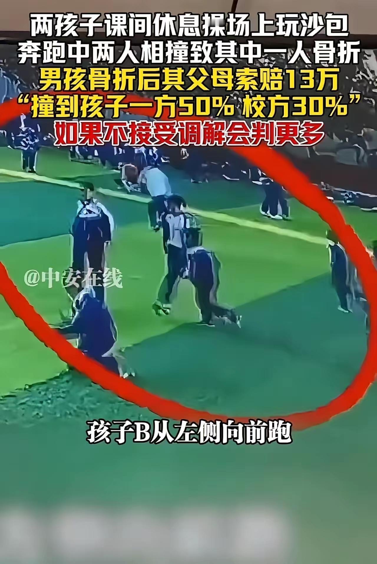 吉林两孩子课间相撞,一孩子骨折家长索赔13万,调解方案让网友炸了。 监控拍得明明白白,受伤孩子边跑边回头主动撞上去,结果王家要赔50%的6万多,差不多是一年工资,不接受还可能多赔。 王刚憋屈到极点,直言故意撞人砸锅卖铁也赔,哪能谁伤谁有理。 网友吐槽判决离谱,这逻辑简直像“犯错的人喊冤,无辜的人买单”,既教坏孩子,还可能把校园变成不敢奔跑的牢笼。 司法调解别和稀泥,丢了公平正义,养出的只会是遇事推诿的巨婴。