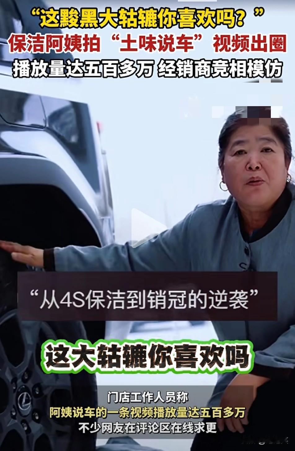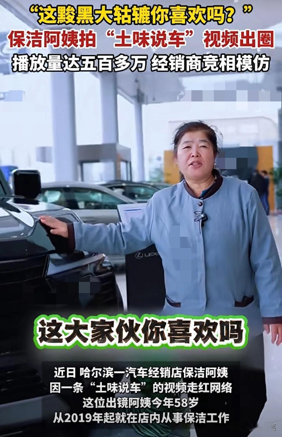 谁能想到 4S店保洁阿姨随手拍的“土味说车” 能把百万级汽车博主按在地上摩擦 哈尔滨58岁保洁阿姨 用“这黢黑大轱辘你稀罕不”的唠嗑式话术 单条视频播放破500万,连同行经销商都抢着抄作业 她不是专业车评人,甚至说不全汽车参数 但“不端着”的亲切感 刚好戳中了网友对“套路营销”的审美疲劳——现在的流量密码 早从“专业话术”变成了“真实人情味儿” 这哪是阿姨的逆袭?明明是汽车圈终于懂了 比起背参数,老百姓更爱听“实在嗑儿”。