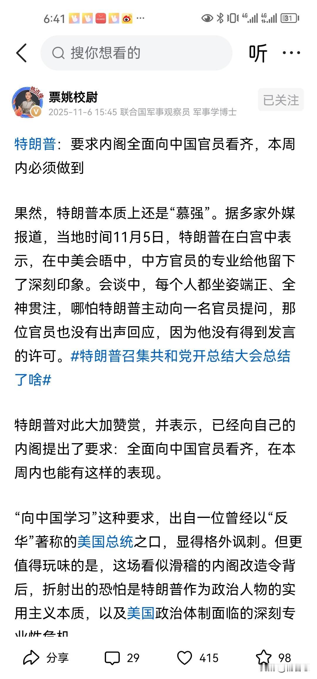 美国打不过中国就加入?特朗普要求美国内阁向中国学习?这句话听听就可以了。西洋人的强盗骨子里是不会改变的,除非把他们彻底打趴。在中美会谈或交流中,美方总是自以为高人一等,居高临下,傲慢自大,滥用国际法对你横加指责,甚至是威胁恐吓,这都是他们一惯的作派和通病。关键是他们没有实力,还想装作有实力,他们会狐假虎威,还会装模作样。