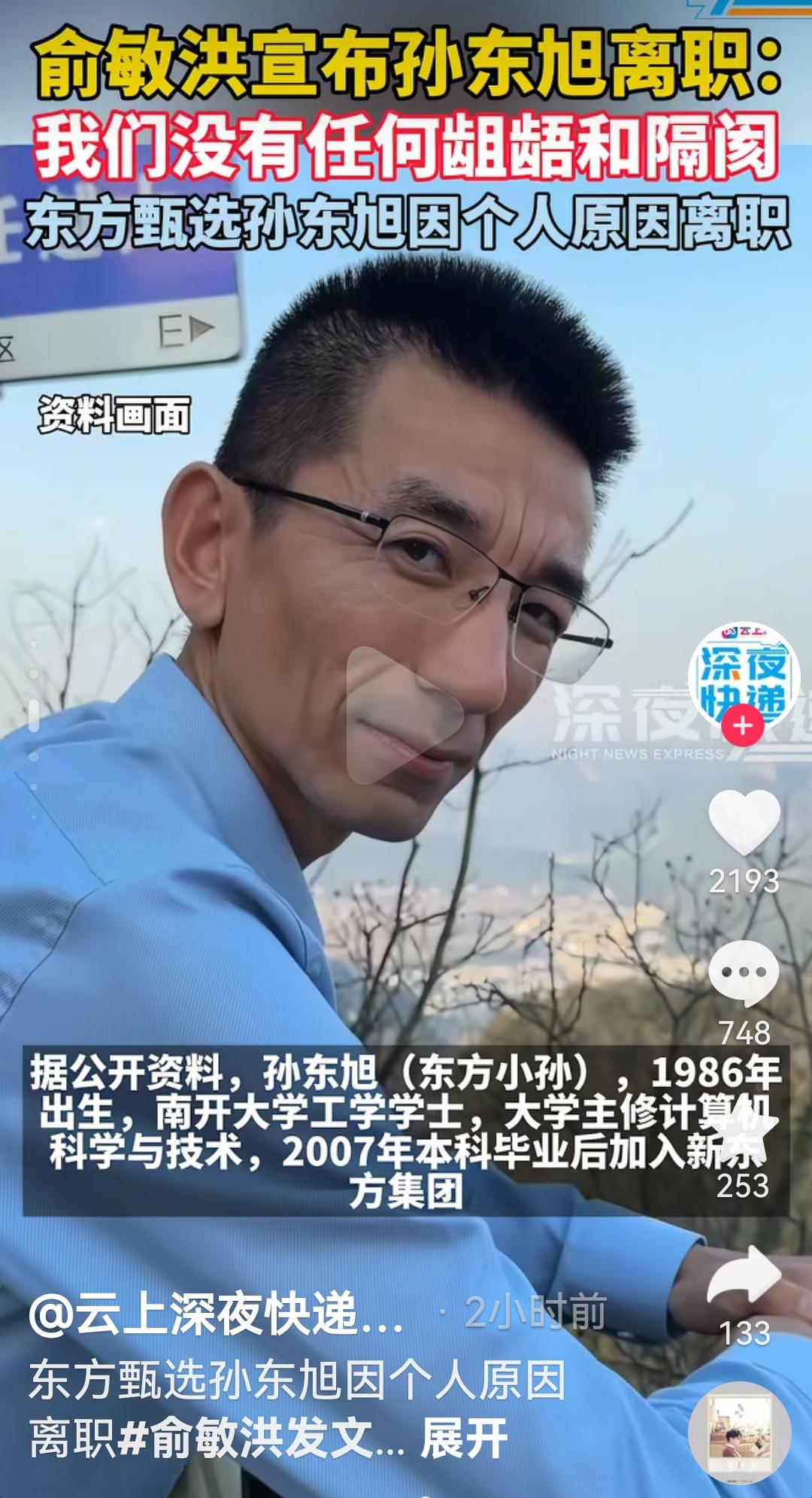 东方甄选前CEO离职了 根据东方甄选现在CE0俞敏洪发文,因东方甄选孙东旭个人原因离职 这就是结束也是开始啊,从东方甄选小作文事件到现在快2年了,最终还是离开了 职场有聚有散,都是各自完成了自己的工作,奔赴下一个工作东方甄选销售额 甄选东方 东方甄选下跌 图片来自云上深夜快递视频
