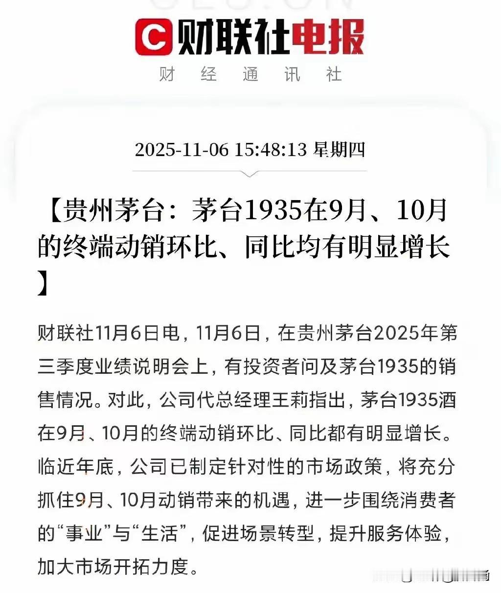盘后传来利好!茅台1935在9月,10月均有明显增长,怎么说呢?茅台1935属于千元单品,在市场消费不很景气的情况下,力推1935,个人感觉是一个好策略,而且成效显著,9月和10月终端动销都有增长,是一个不错的开端! 贵州茅台需要一个大阳线,来逆转不断下跌的局面,个人感觉是时候了…