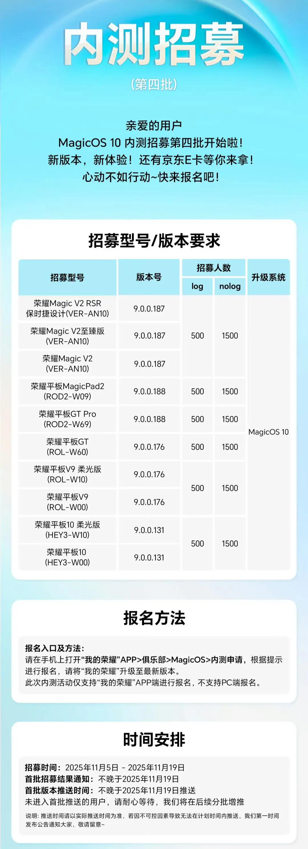 【荣耀MagicOS 10 体验官第四期,火热招募中!🔥】 想抢先所有人,体验最新的系统魅力吗? 这次更新力度空前,绝对是史诗级! 📱 支持机型: ✅ 荣耀Magic V2系列 ✅ 荣耀平板MagicPad 2 ✅ 荣耀平板V9系列 ✅ 荣耀平板GT系列 ✅ 荣耀平板10系列