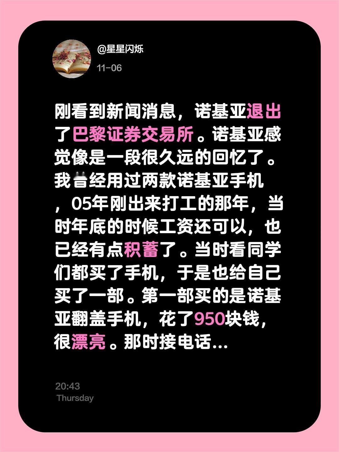 刚看到新闻消息,诺基亚退出了巴黎证券交易所。诺基亚感觉像是一段很久远的回忆了。我曾经用过两款诺基亚手机,05年刚出来打工的那年,当时年底的时候工资还可以,也已经有点积蓄了。当时看同学们都买了手机,于是也给自己买了一部。第一部买的是诺基亚翻盖手机,花了950块钱,很漂亮。那时接电话把手机翻盖,往上面一翻,然后就可以接电话了,当时觉得帅爆了。不过这款手机有一个缺点,就是声音小,它没有扩音器。当时在厂里干活机器声音很大,根本听不见别人说什么?要跑到比较安静的地方才能听清楚,后面也挺后悔的。于是在07年我买了第二部滑盖手机,这款手机声音大,而且还是音乐手机。轻轻往上一划就可以接电话了,具体什么型号,我忘掉了。花了我2200多,当时还是挺贵的,花了我快一个月的工资了,那时候工资也才三千一三千二。后面就没买过诺基亚手机了,买的都是比较便宜几百块钱的。到现在用的也就1000多点,或者是有时候营业厅绑定套餐送的,不再像以前那样追求好看或者什么的了,能用就行。诺基亚手机 老版翻盖手机 诺基亚情怀 诺基亚手机的回忆