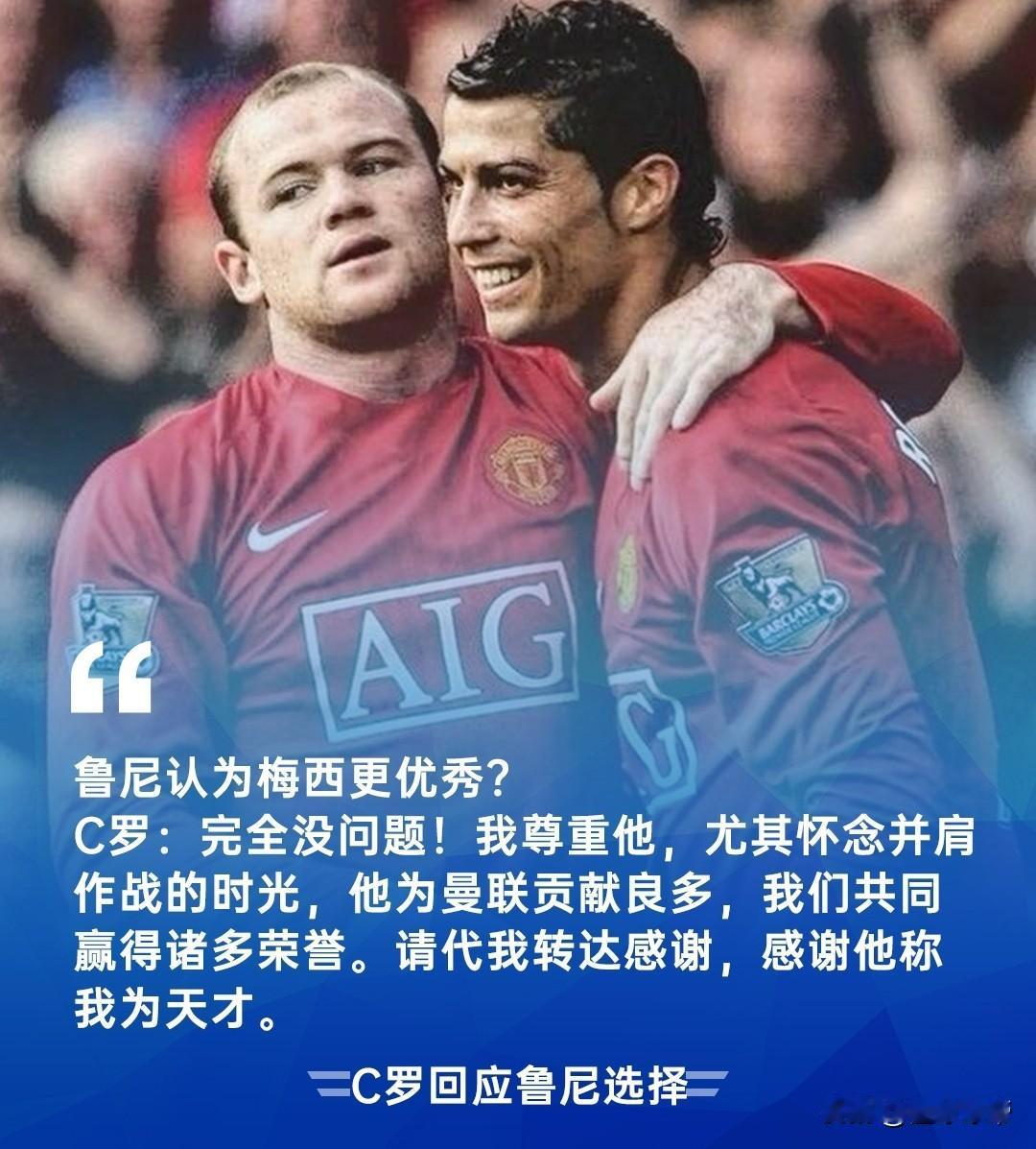 鲁尼说梅西比C罗强?C罗完全尊重鲁尼的看法! 在摩根采访C罗的内容中,摩根问到了关于鲁尼说梅西比C罗强的问题,C罗则表示完全尊重鲁尼的看法,毕竟每个人的思想都不一样,但是他还是感谢和鲁尼在一起在曼联并肩作战的日子。 C罗和梅西到底谁更强?这是一个永远没有答案的问题,每个人心中都有自己的判断,C罗也深知人无完人,只要做好自己就行,不管别人怎么说,自己只要不停的进球就行。 年龄越大C罗也看的越开了,也不再是曾经那个年轻气盛的小伙子了,不会再在意别人怎么说了,历史自由定论。