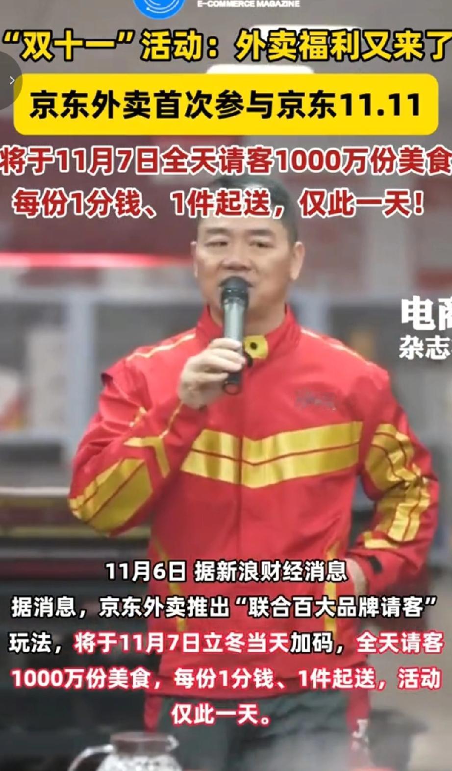 京东外卖首次参与京东11.11,将于11月7日全天请客1000万份美食,每份仅需1分钱,1件起送,且活动仅此一天。此次参与活动的品牌有,瑞幸、库迪、塔斯汀等餐饮品牌将轮流提供1分钱爆品;双11期间还有更多大牌爆品低至9块9双京东外卖平台已入驻超200万品质餐厅。份。