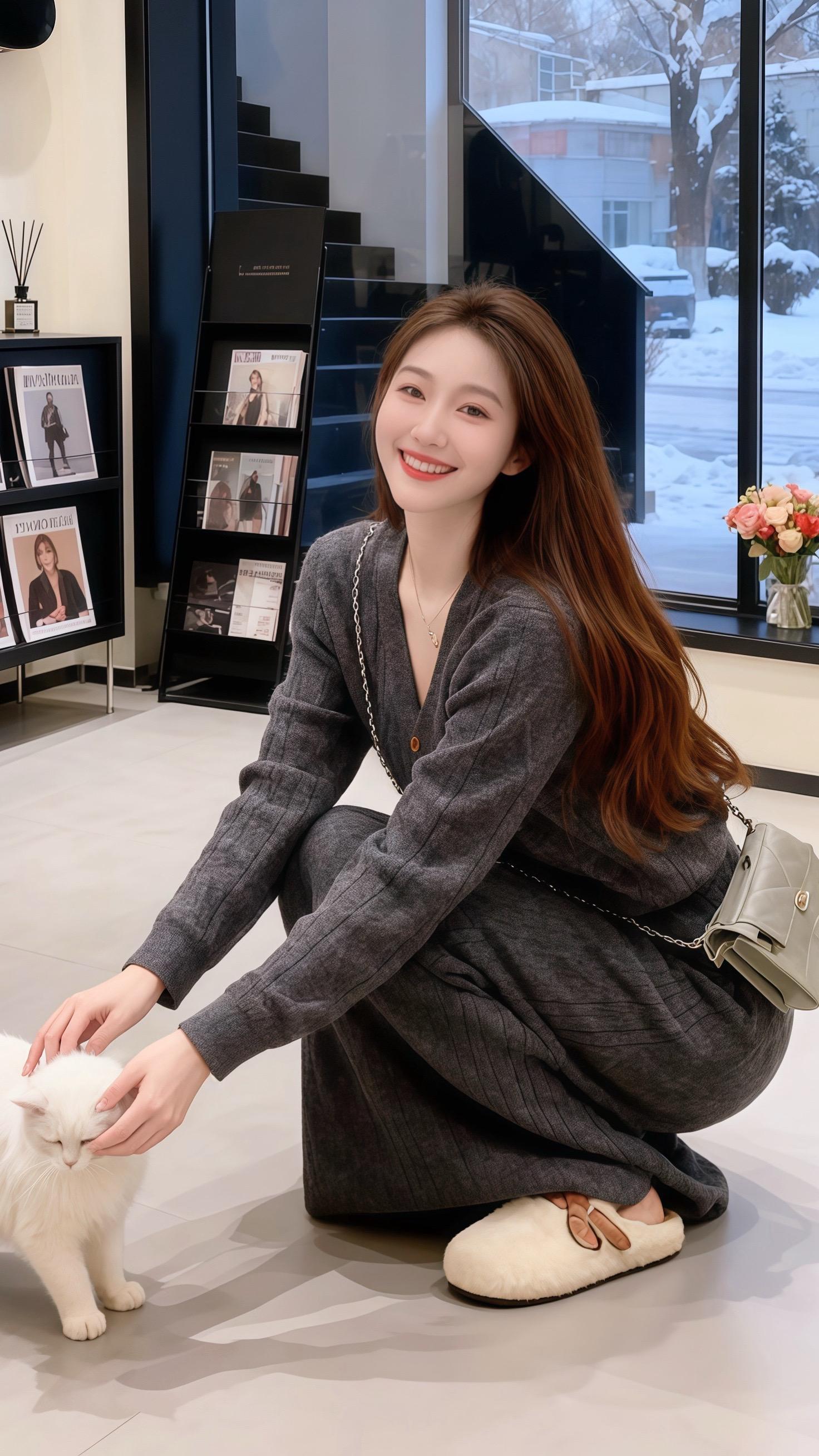 她蹲下来揉白猫的软毛时,裙摆垂落的褶皱裹着热咖啡的雾,绒拖蹭过地砖的轻响,混着窗外雪粒敲玻璃的声。抬眼时,投屏里映出她的侧影:V领露的细颈、开衫收的腰线,连浅灰包的链光,都像把冬的冷揉成了软的诗。