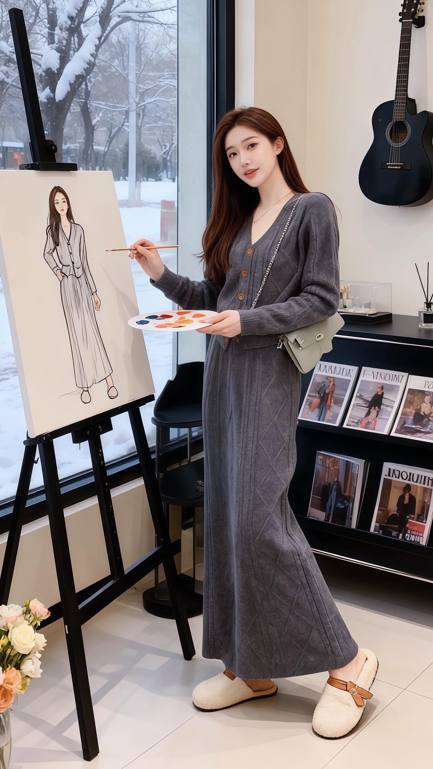 握着画笔给穿搭稿填色时,她指尖沾的颜料蹭在开衫袖口,却笑出了声——毕竟这套装的温柔,本就该裹着生活的细碎暖意。