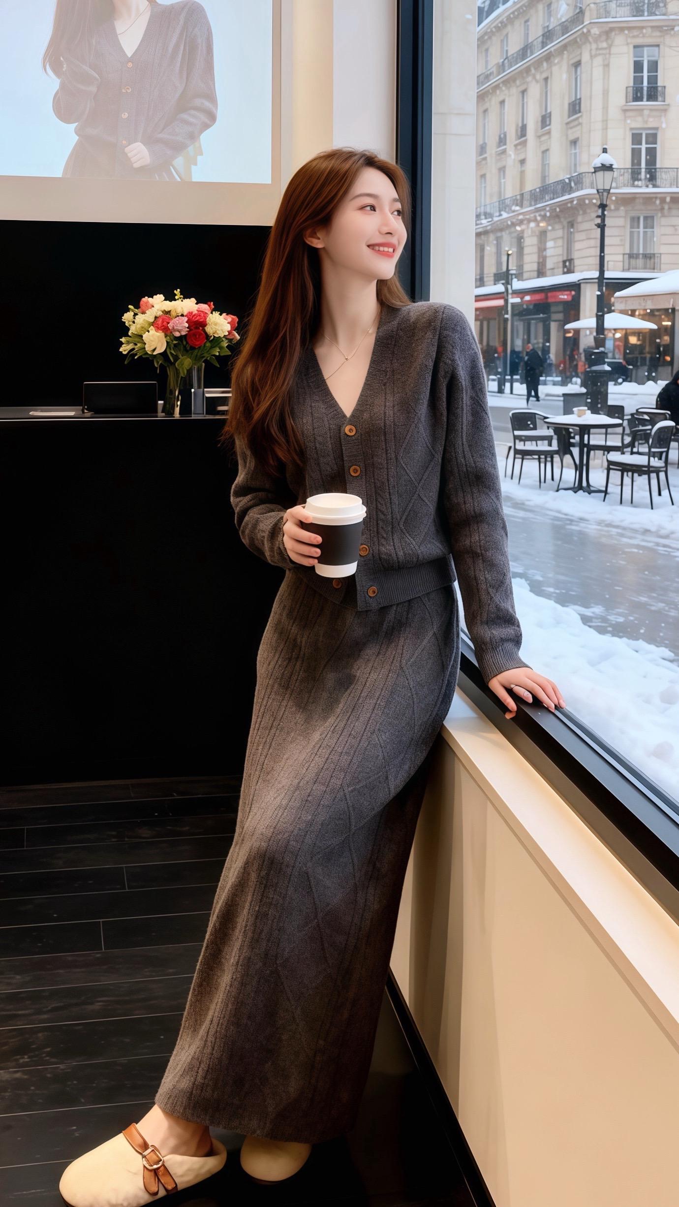 《雪天里,她的灰针织套装是温柔本身》落雪沾湿窗沿的傍晚,林微指尖碰过模特身上的灰针织开衫——和她身上那件的菱格纹理,连软度都暖得恰好。