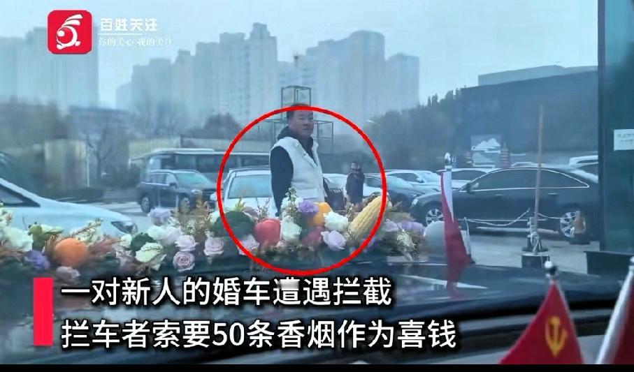 太无耻了! 一下要50条香烟! 11月5号,河北省廊坊市一对新婚夫妇婚车被拦,拦