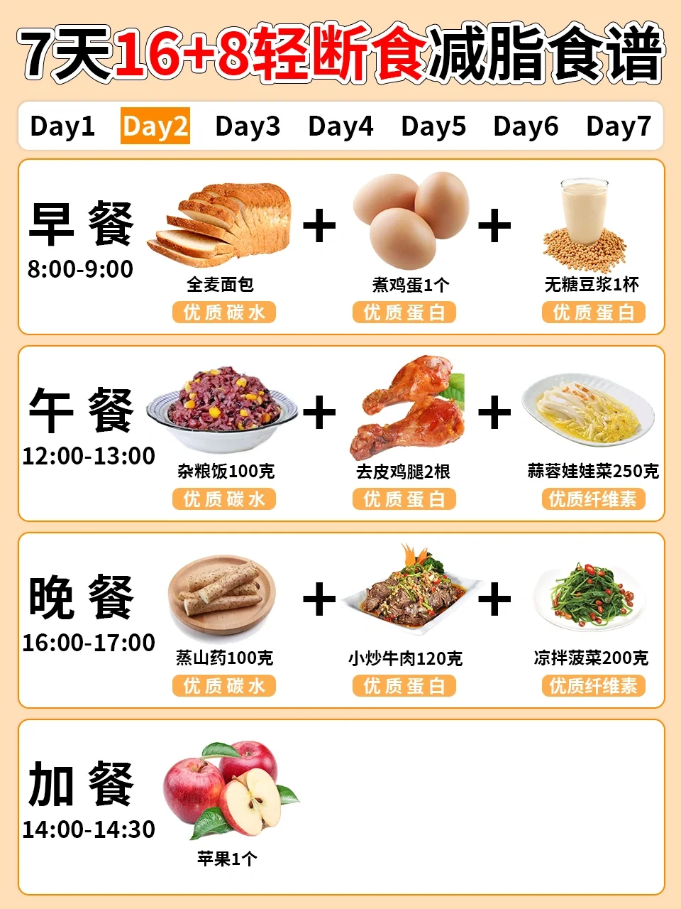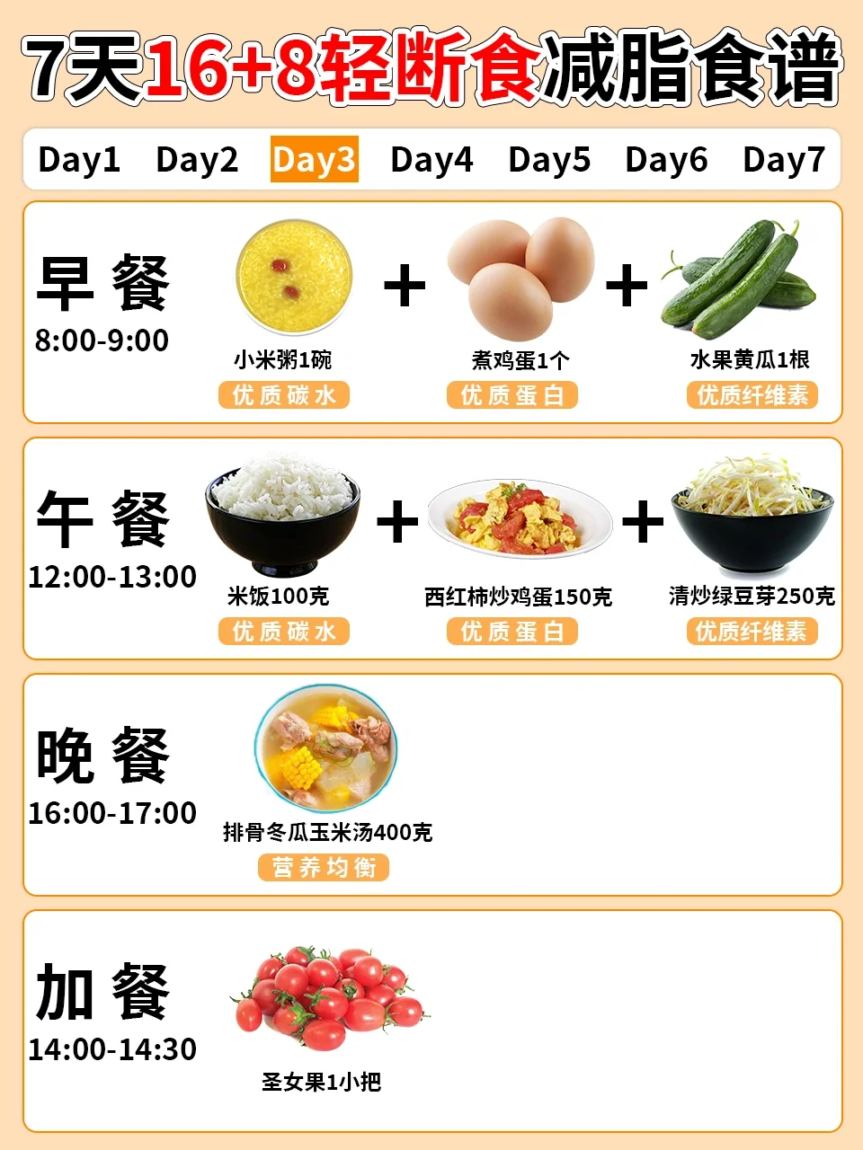 今天为大家分享一个7天16+8轻断食食谱,营养均衡的减脂餐与16+8轻断食减脂法相碰撞,真的太好瘦了[赞R][赞R][赞R] ⚠️注意 1.加餐不是得吃不可,如果下午不饿就不用吃 2.16+8轻断食就是要8小时内吃完一日三餐,其他16个小时不吃任何东西,不过可以喝水‼️大家可以根据自己的时间安排一起三餐,能保证8小时吃完一起三餐就可以🥰🥰 想减脂的宝子们吃起来吧[派对R][派对R]