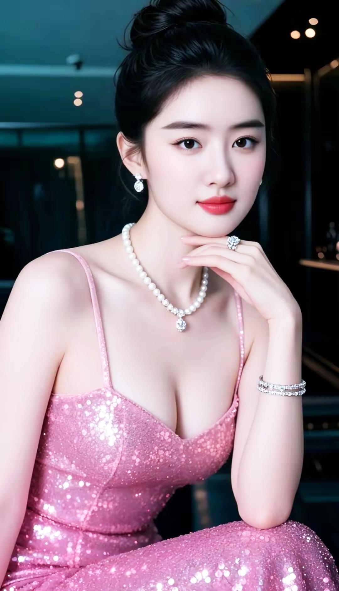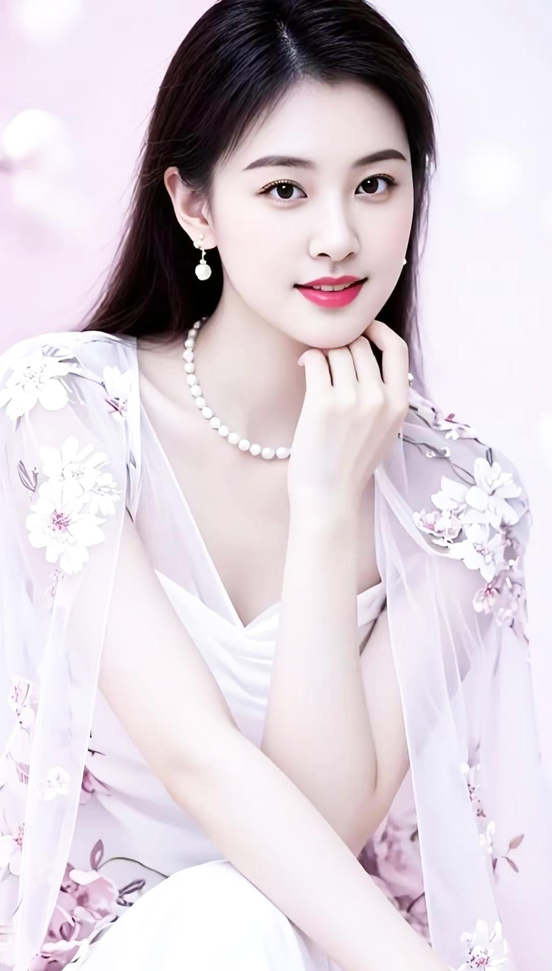 优雅气质女神,粉色花裙配珍珠项链,甜美动人!🌸💎