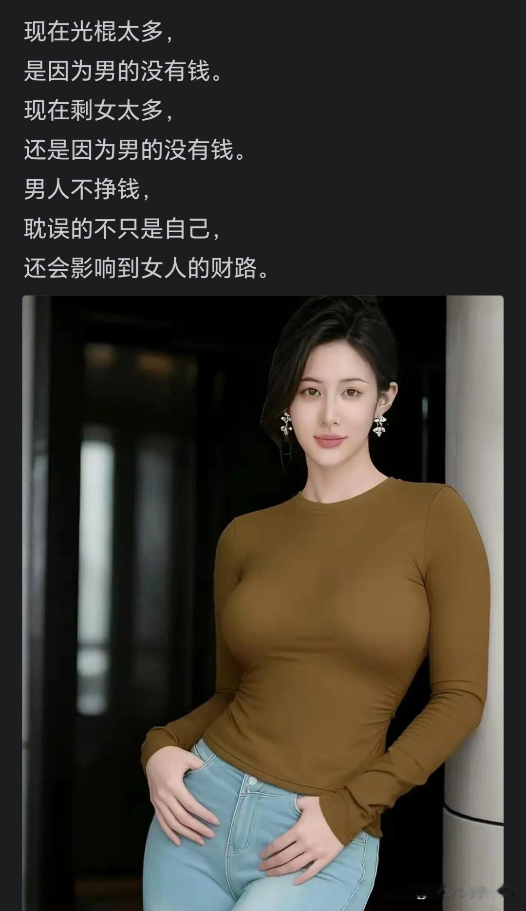 现在流行的一种很负责任的“甩锅”说法: 叫剩女太多,都是因为男人没钱; 而男人没钱都是因为他们挣的太少! 可现实生活中: 大多数的男人们都在兢兢业业的当牛做马; 可相当多的女人却是悠哉悠哉乐在逍遥; 还有“大龄仙女”给自己找个非常高大上的借口:见识过雄鹰的女人,又怎么可能会爱上野狗? 所以,最后的剩女逻辑就变成了: 不是自己要的多,都怪男人挣得少‼️