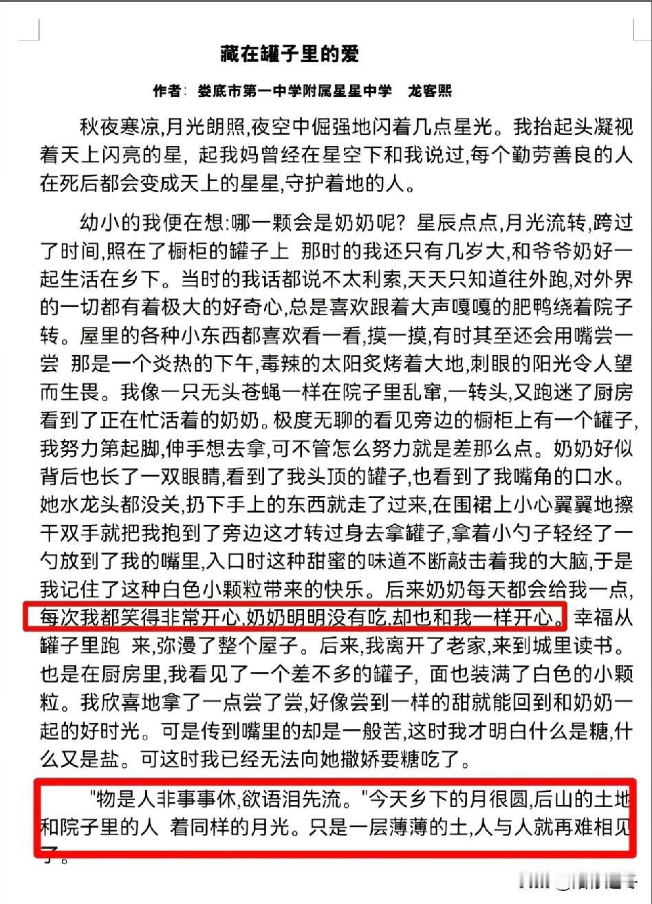 藏在罐子里的爱! 男生的作文登上《人民日报》了,它是来自一位初中生写对奶奶的怀念。没有华丽的语言,只有最真诚的感情流露让无数人共鸣,或许这才是作文,这才是文学该有的样子。 也许,只有年少时的心灵和清澈的眼神,才能展现人性最真实的感受。这样的文章远比某些作协的作家,写得更有味道,而被正常人接受。 最喜欢文中的这段话了“物是人非事事休,欲语泪先流。后山的土地和院子里的人沐浴着同样的月光,只是那层薄薄的土,人与人就再难相见了。” 这段话代入感很强,让我想起小时候,奶奶每天起早贪黑到镇上卖菜,一天下来挣不了10来块。 初二那年堂哥给的单车被偷了,实在不忍心让家里人再买,每天来回几公里的上下学,后来奶奶硬是拉着我到单车店买了一台,10块5块2块1块的硬是凑了100多元…… 这么多年过去了,单车也不见了,奶奶也不见了,再也看不见一面了。坟头草青了又黄,黄了又青,爱我的奶奶去了远方![流泪] 把故事写进作文 对奶奶临终的爱