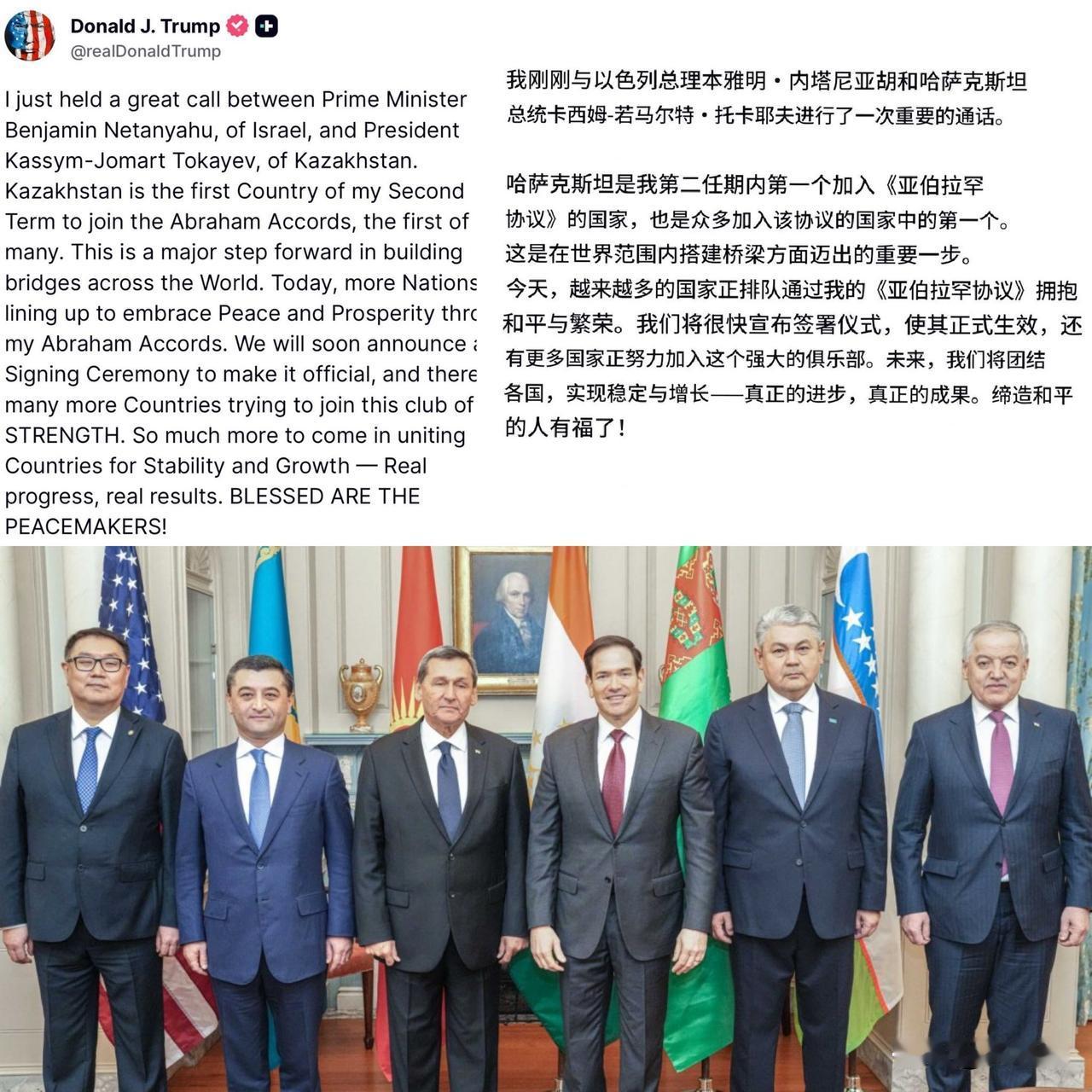 【突发】川普宣布哈萨克斯坦加入亚伯拉罕协议 中亚五国外长昨天去华盛顿卢比奥开了个会,所以其他四国应该也会陆续宣布这一消息。 中亚五国此前都已与以色列建交,这次加入协议意味着将加强与以色列和美国的关系,同时鼓励更多穆斯林国家与以色列关系正常化。