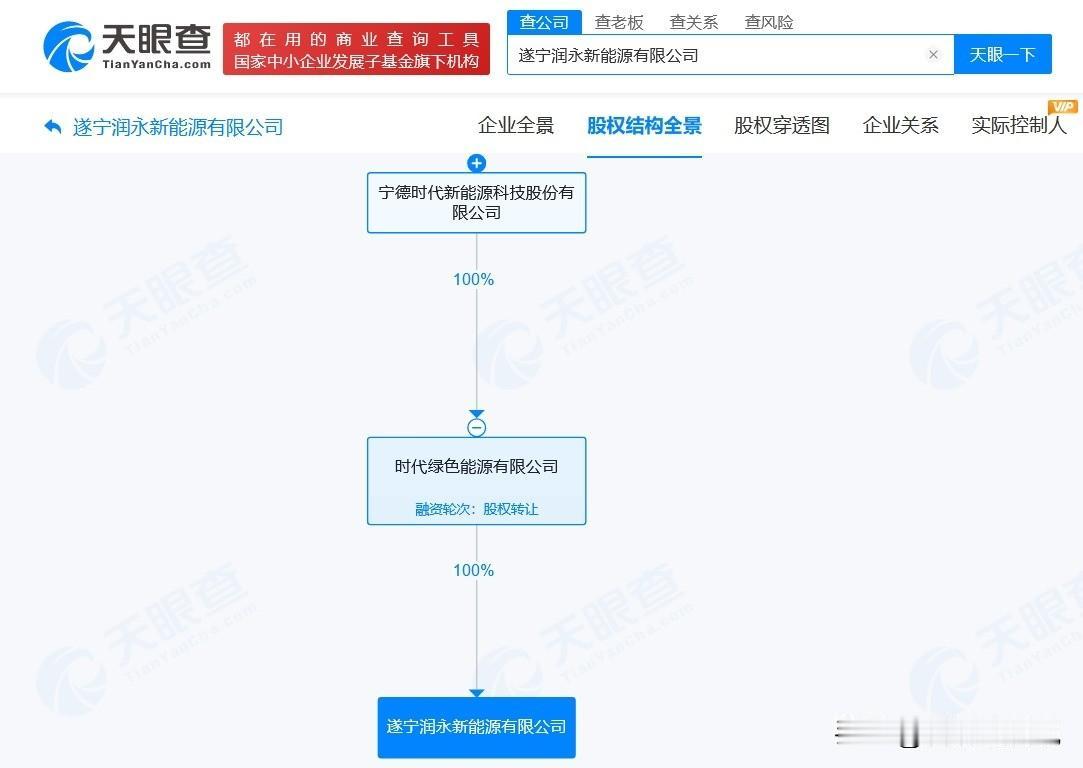 【宁德时代在四川遂宁成立新能源公司 注册资本420万】 天眼查工商信息显示,近日,遂宁润永新能源有限公司成立,法定代表人为戴维,注册资本420万人民币,经营范围含发电业务、输电业务、供(配)电业务,建设工程施工,新兴能源技术研发,太阳能发电技术服务,热力生产和供应,合同能源管理,在线能源计量技术研发,信息系统集成服务,信息系统运行维护服务等。股权全景穿透图显示,该公司由时代绿色能源有限公司全资持股,后者为宁德时代(300750)全资子公司。 天眼查信息: