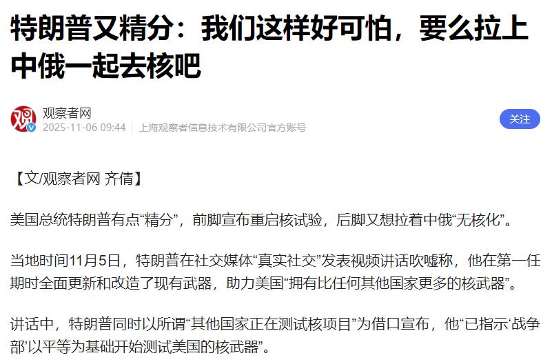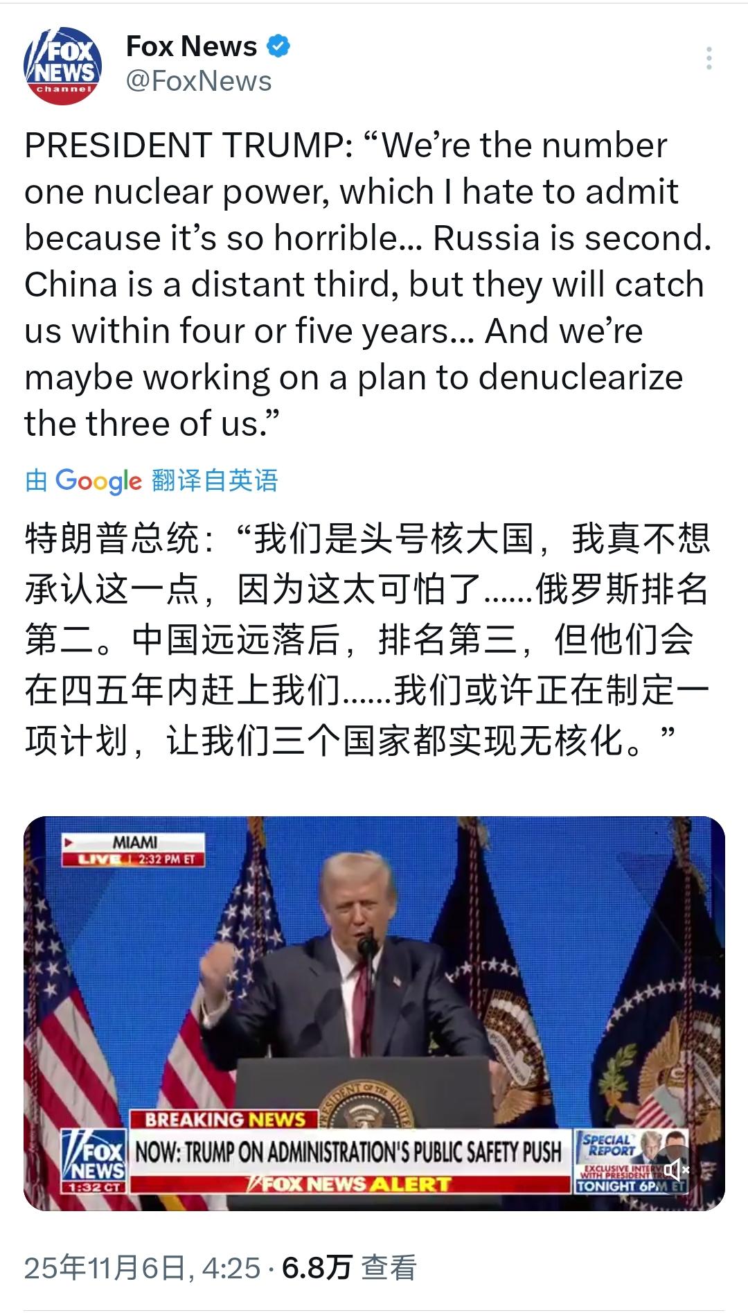 美国刚宣布重启核试验 后脚想拉上中俄“”无核化“”?   11月6日,特朗普自豪的声称“”我们是头号核大国“”,还表示中俄都落后于美国。结果最后话风有一转表示“”我们或许正在制定一项计划,让我们三个国家(中美俄)都实现无核化“”。   但讽刺的事,美国前脚才在10月底宣布要重启中断33年的核试验,现在后脚就忙着给中俄打电话谈无核化,特朗普的想法也太过于异想天开了。   根据斯德哥尔摩国际和平研究所2024年的统计,美国手里握着约5200枚核弹头,俄罗斯则紧握近6000枚。相比之下,中国只有仅仅410枚左右,却被硬生生拉进“”三巨头无核化“”的剧本里,这戏份分配未免也太随意了。   更有意思的是,特朗普之前给出的重启核试验理由,说“”其他国家也在进行试验“”,可联合国裁军研究所2024年的报告明明白白写着,近十年全球唯一进行过核爆炸试验的只有朝鲜,还是在2017年。   俄罗斯最近测试的“”波塞冬“”核动力鱼雷,不过是运载工具而非核爆炸试验,中国更是一直遵守《全面禁止核试验条约》,美国战略司令部9月的报告都承认这一点。   美国能源部2024年的报告也早就说过,通过超级计算机模拟能替代90%的实际核试验,现在非要劳师动众重启试验,大概是觉得屏幕上的爆炸不够有威慑力,得真炸点什么才能显得自己厉害。   美国过往在核军控领域的表现,简直是“退群专业户”。2002年退出《反弹道导弹条约》,2019年撕毁《中导条约》,如今美俄之间仅存的《新削减战略武器条约》还有100天就要到期,却忙着重启核试验,这操作就像一边拆着自家的防火墙,一边要求邻居们都把大门敞开。   内华达试验场自1992年封存后,基础设施早就老化不堪,美国政府问责办公室评估说要恢复试验至少需要24个月和数十亿美元,可特朗普团队偏要喊着“六个月内重启”,这着急上火的样子,不知道的还以为是赶着参加什么核试验锦标赛。   最耐人寻味的是拉中国加入无核化谈判的动机。美俄两国的核弹头加起来占全球总数的90%以上,按道理要裁军也该先从这两个大户开始,却非要拉着只有410枚的中国凑数。   我们一直坚持最低限度核威慑政策,承诺不首先使用核武器,现在却被要求和拥有五千多枚核弹头的美国谈无核化,这逻辑就像让骑自行车的和开坦克的比赛谁先弃械投降。   美国内部对这事也不是铁板一块,民主党领袖杰弗里斯已经明确反对,说这会“破坏美国道德领导力”,反核组织还在发起法律诉讼,质疑总统单方面重启试验的权限。一边给核反应堆添燃料,一边给谈判桌摆茶杯,这种左手矛右手盾的把戏,恐怕连自己人都看不过去。   俄罗斯已经放话要“对等回应”,中国的试验场也处于“维护状态”,真要是引发核竞赛,美国这个“头号核大国”怕是第一个坐不住。毕竟喊着要无核化的是他,忙着造核弹的也是他,最后要是真闹得不可收拾,这出喜剧怕是要变成悲剧了。