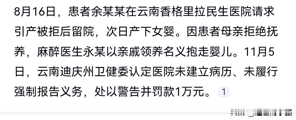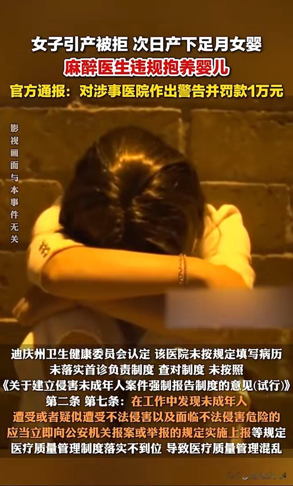 没有规矩不成方圆,任何事情都要在规矩和法律的情况下操作。如果违规操作,那只有被处罚的份。 女子引产被拒诞下女婴被医生抱养。 8月16日,女子要求引产被拒绝,结果第2天就生下了女孩。 想引产的话为什么不早一点,都要生了还想引产,那肯定会不会同意的。 这也说明女子将自己的人生过得很糟糕,当初为什么要怀孕呢? 到底经历了什么?怀了又不想要。 这医生也不地道,违规抱养。 当然处罚也不是很严重,才罚医院1万块而已。 我想知道孩子现在到底在哪?