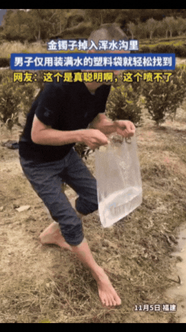 “人怎么能聪明成这样?”福建,一男子不小心把金镯子掉进了水沟里,找了半天没找到,他又不想放弃,于是想出了一个 小妙招,网友看后直呼聪明。 谁都知道泥水里又浑又暗,用手摸纯属大海捞针,可大哥偏不蛮干。 他找了个装水的塑料袋往沟里一放,神奇的是,塑料袋瞬间变成“简易探测仪”,底下的东西看得清清楚楚,第二次尝试就精准锁定金镯子。 这哪是运气好,分明是遇事不慌、善于变通的本事! 很多人碰到突发状况就乱了阵脚,却忘了生活里的小难题,往往藏着低成本的解决办法。 不过话说回来,再聪明的妙招也不如事前稳妥,金镯子这类贵重物品,平时多留心保管才是最省心的。