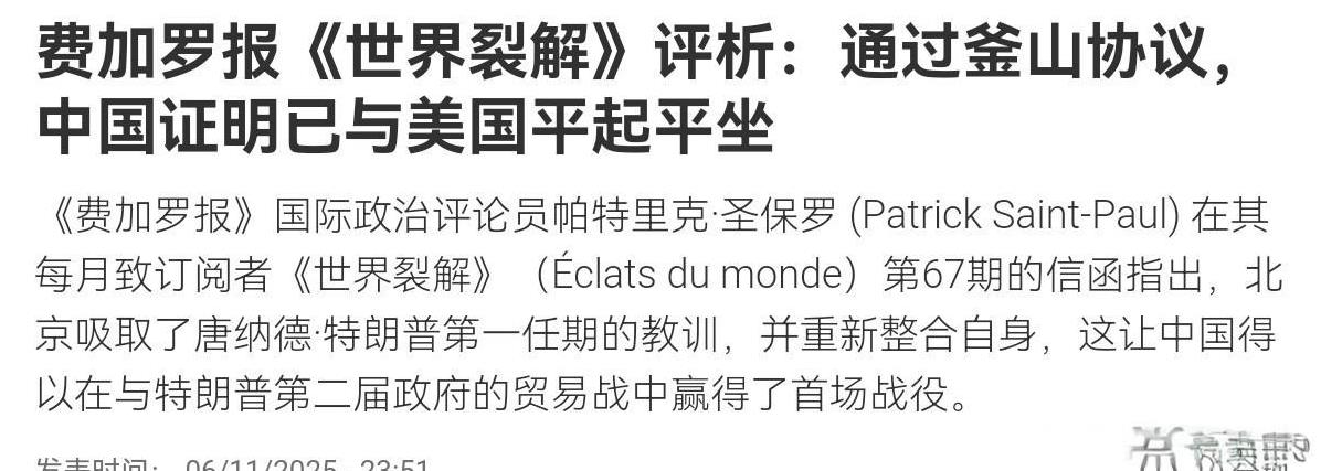 法媒表示,通过釜山协议,中国证明已与美国平起平坐!11月7日,法国《费加罗报》刊文表示,北京显然吸取了唐纳德·特朗普第一任期的教训,并重新整合自身,这让中国得以在与特朗普第二届政府的贸易战中赢得了首场战役。中美两国上周在韩国釜山“化干戈为玉帛”。然而,双方接受的是只是战术性缓和,而非战略性和解。 法媒表示,但协议的进程显示出中美权力格局的杠杆正转向北京。一个新迹象尤为明显:特朗普在新任期内一开始对中国咄咄逼人,但特朗普这一次明显做不到这一点,而变得“讨好”中国。法媒认为,中国强硬的回击,足以证明自己可以与美国平起平坐,而中国已经做好了与美国在新的全球博弈中分庭抗礼的准备。 对于法媒的这一论断,我们怎么看呢?毫无疑问,法媒的论断完全正确。中国确实是以平起平坐的态度在跟美国打交道,相信我们的对等反制已经让美国足够意识到这一点。而釜山协议,事实上只是我们跟美国平起平坐打交道的阶段性结果而已。现在中美双方当然是战术性的缓和,而非战略性的和解,但是即便没有战略性的和解,美国又能够奈我们何呢? 贸易战,科技展,军事围堵,美国对我们的手段一个接一个,但结果呢?结果美国没有占到丝毫的便宜。未来美国不跟我们达成战略性和解,美国还有什么牌呢?因此,我们有足够的耐心,也有足够的底气让美国明白,中美最好是和平共存。跟美国分庭抗礼不是我们的目标,我们的目标始终是让自己发展的更好,并以此促进全球的和平与发展。一句话,中国的富强之路,不是美国能够阻挡得了的!