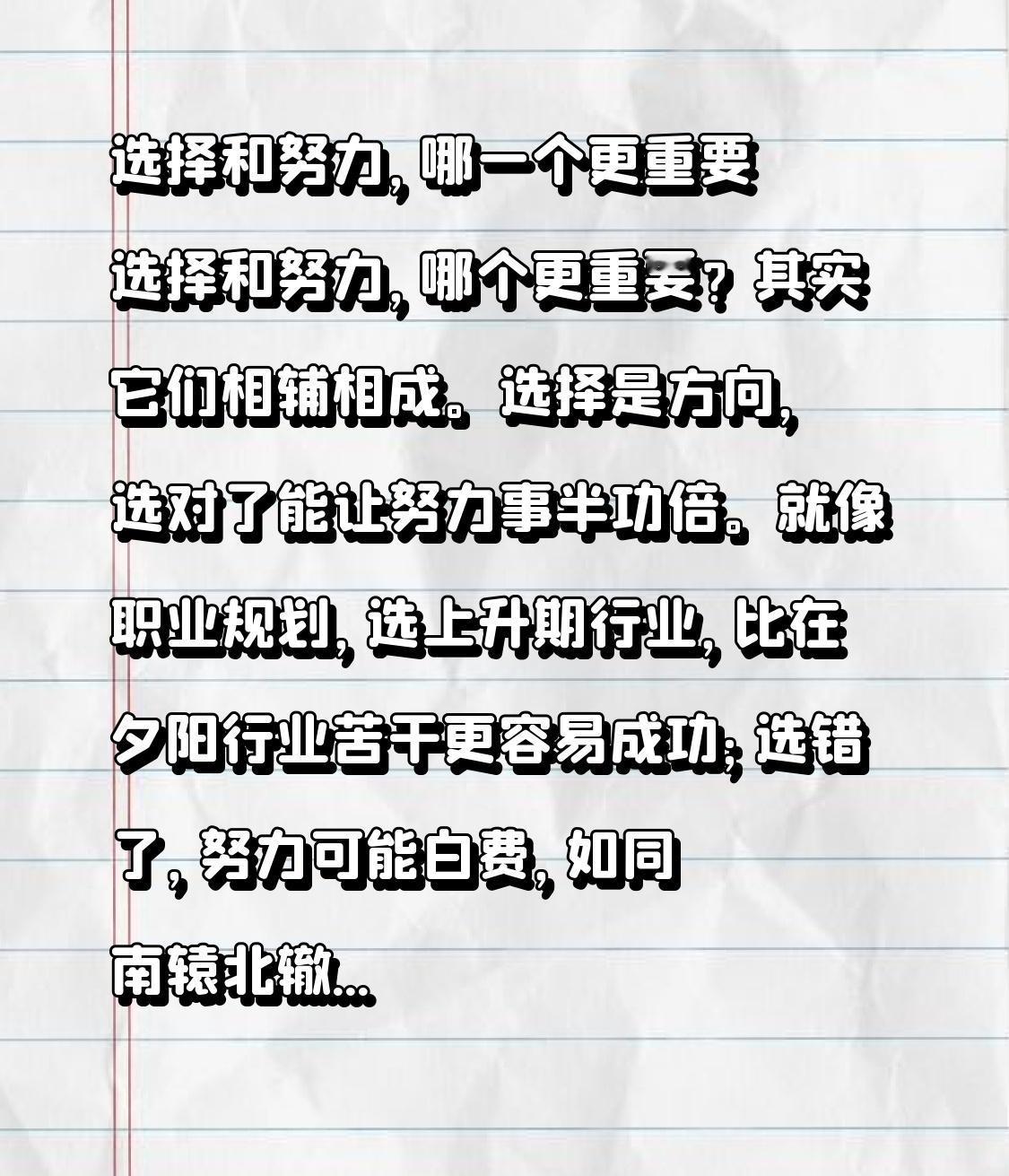 选择和努力,哪一个更重要 选择和努力,哪个更重要?其实它们相辅相成。选择是方向,选对了能让努力事半功倍。就像职业规划,选上升期行业,比在夕阳行业苦干更容易成功;选错了,努力可能白费,如同南辕北辙。 但光有选择不够,努力是基石。再好的选择,不付诸行动,机会也会溜走。而且努力能拓宽选择边界,提升能力后会有更多优质选择。 有个朋友智商普通,却因跟对老板,跟着入股分红年入百万。所以,人生就是“选择 - 努力 - 再选择 - 再努力”,关键节点选对,再用努力实现价值。