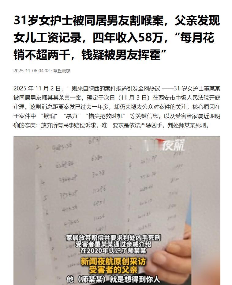 陕西西安,一女护士4年工资达到了58万元,谁知大部分工资都被男友花了。男友不仅拿这些钱给原配妻子买奢侈品,还带儿子去高档餐厅,反而要求女护士节省一点,甚至对她长期家暴。女护士受不了后提出分手,结果被气急的男友持刀杀害。目前,女护士的父亲坚决不要任何赔偿,只求以命偿命。(来源:章丘融媒) 据悉,女护士董某和男友师某是在2020年左右认识的,当时有一位亲戚给董某和师某做了介绍。 董某一开始只知道师某在企业工作,对他的真实情况并不了解,而师某则隐瞒了已婚且有儿子的事实。 随着师某平时的体贴照顾,他和董某逐渐擦出了爱的火花,后来便同居了起来。然而在同居的第一个月,师某就对董某动了手。 董某本来想向家人求助,但师某却以亲戚介绍为由,称闹大了大家都没面子,威胁董某不要告知家人,还写下保证书以保证今后不再对董某动手。 之后一段时间,师某的确未在对董某动过手,这让董某放宽心不少,可是师某却把目标转向了董某的工资。 董某当时一个月的收入有1.2万元左右,如果夜班多的话可以拿到1.5万元,但是董某十分节省,在二人同居的4年期间,董某的月花销没超过2000元,她准备攒点钱以后买个小房子。 令人没想到的是,师某却把董某的大部分工资花在了给妻子买奢侈品,带儿子去高档餐厅享受。钱花了以后,师某却让董某平时省着点花,还让董某去找闺蜜借钱谎称投资。 在二人同居期间,师某并未遵守当初不家暴董某的承诺,甚至变本加厉限制董某的社交。只要董某敢和其他异性有过多接触,就会遭到毒打。 2024年3月份,父亲发现了董某身上的伤痕,气得立即报了警。但警方介入后发现二人是男女朋友关系,所以仅对师某做了批评教育,并没有采取强制措施。 同年6月20日晚上,师某开车去接董某下班。董某坐上车后思索再三,然后向师某提出了分手。 万万没想到,师某突然抽出一把水果刀,拽住准备下车的董某,不顾董某的哀求,持刀狠狠地捅向师某的脖子。之后师某开车在外瞎转悠,就是不带董某去医院治疗,直至董某死亡后才报了警。 警方赶到现场后,师某称自己是正当防卫,是董某先动的手。然而师某的谎言很快就被识破,一段监控录像还原了师某的行凶过程。 事后,悲痛欲绝的董某父亲坚称不要任何的赔偿,只求法院判处师某死刑。 有网友表示,这是哪门子亲戚?介绍人之前不调查下对方背景的?人家都结婚了还介绍? 还有网友表示,这样的男人太渣了,必须判处死刑。吃软饭还敢家暴杀人?谁给他胆了? 那从法律角度来看,师某的行为该如何定性? 首先,师某持刀故意伤害董某,且未对董某进行救治,说明他主观上是打算放任董某死亡的。 因此,师某的行为构成故意杀人罪。 《刑法》第232条规定,故意杀人的,处死刑、无期徒刑或者十年以上有期徒刑;情节较轻的,处三年以上十年以下有期徒刑。 只要董某的家属坚决不接受赔偿,坚决不接受道歉,坚决不谅解,那师某大概率会被判处死刑。 即便师某有认罪认罚的行为,但认罪认罚不是必须减轻处罚,而是可以减轻处罚,这是有选择性的,选择的依据就是师某的行为是否恶劣,社会危害是否极大。 师某故意隐瞒已结婚生子,与董某同居生活,还家暴董某,这显然是极为恶劣的,所以师某被判处死缓的概率也极小。 除了故意杀人罪外,师某还涉嫌重婚罪。 师某明明已经结婚生子,却在婚内出轨董某,甚至和董某公开生活居住,这符合重婚罪的构成要件。 《刑法》第258条规定,有配偶而重婚的,或者明知他人有配偶而与之结婚的,处二年以下有期徒刑或者拘役。 按照数罪并罚来处置,对师某也应当处死刑。 最后,这给亲戚朋友介绍对象的,一定要先查清楚双方的底细,别为了一点小恩小惠,就胡乱介绍。毕竟一旦分手或闹离婚了,那以后见面得多尴尬。 对此,您怎么看?欢迎留言交流。