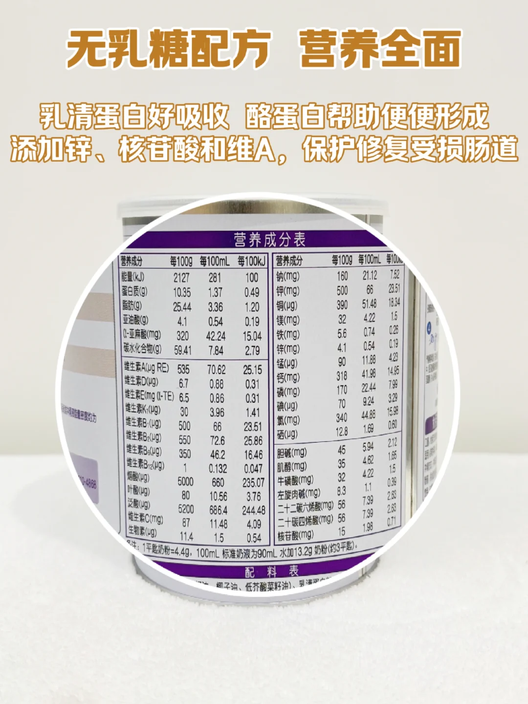 [向右R]我对比好几款无乳糖奶粉,最终选的雀巢家的,这款奶粉不仅是无乳糖奶粉,[种草R]而且里面的营养也很全面,添加了钙、铁、锌、维D等这些营养元素,满足宝宝成长营养需求!里面的锌、核苷酸和维生素A,能够保护和修护受损的肚肚内部。[氛围感R]并且它的乳清蛋白和酪蛋白比例为6:4,更容易吸收,同时帮助便便成型!