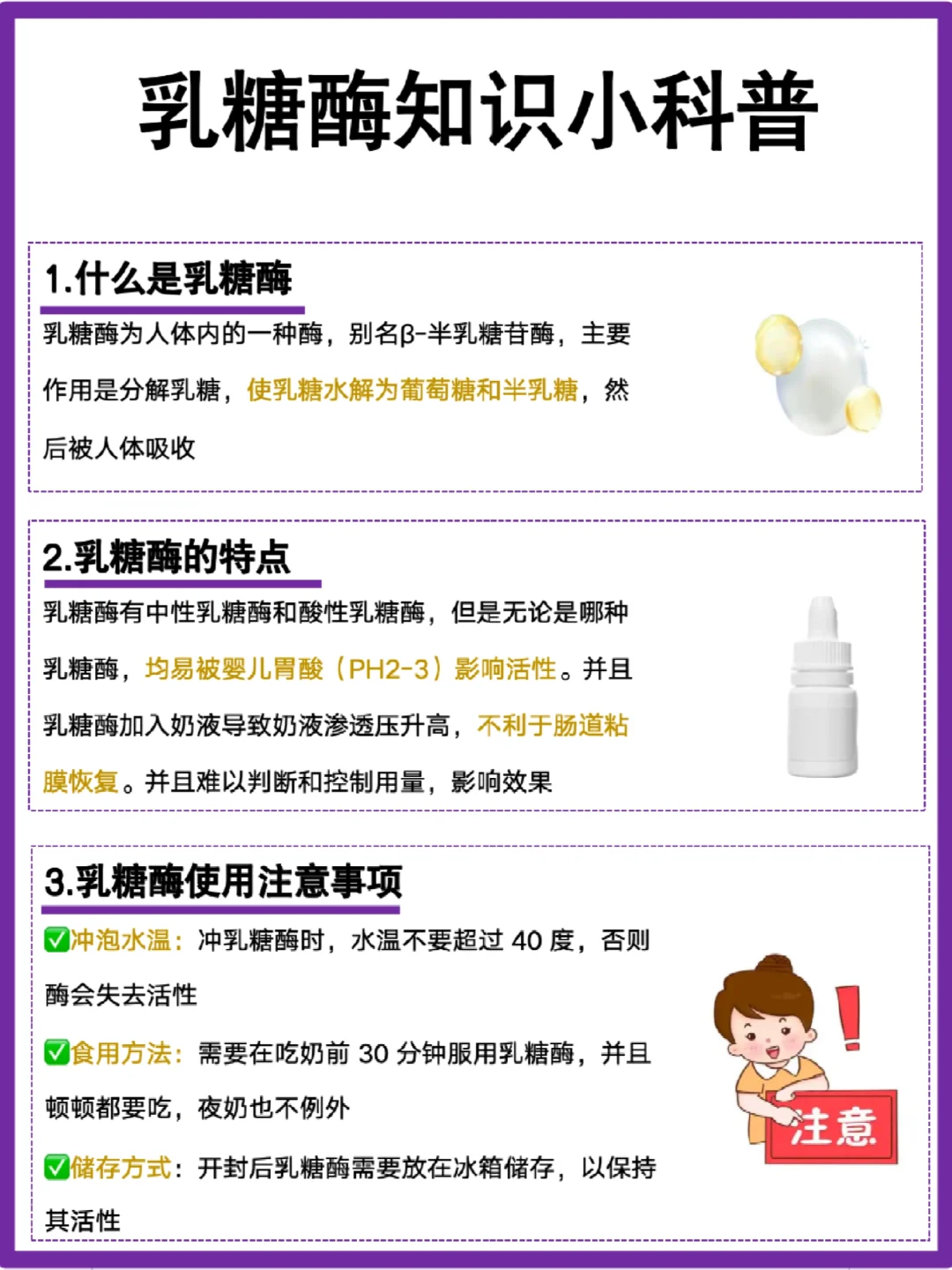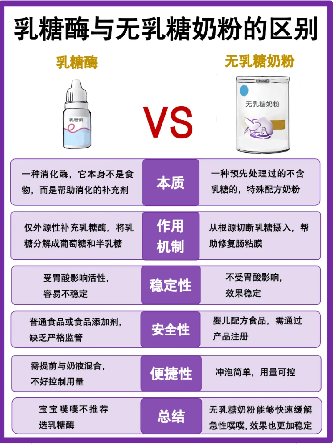 乳糖酶是靠外源性补充乳糖酶,受胃酸影响活性,容易不稳定,[捂脸R]每顿奶前都需要需要加乳糖酶,操作比较麻烦,而且不好控制量,量少没效果,量多有担心刺激肠胃!而且乳糖酶属于普通食品或食品添加剂类别,管理比较宽松,给小宝宝吃也没那么安心!