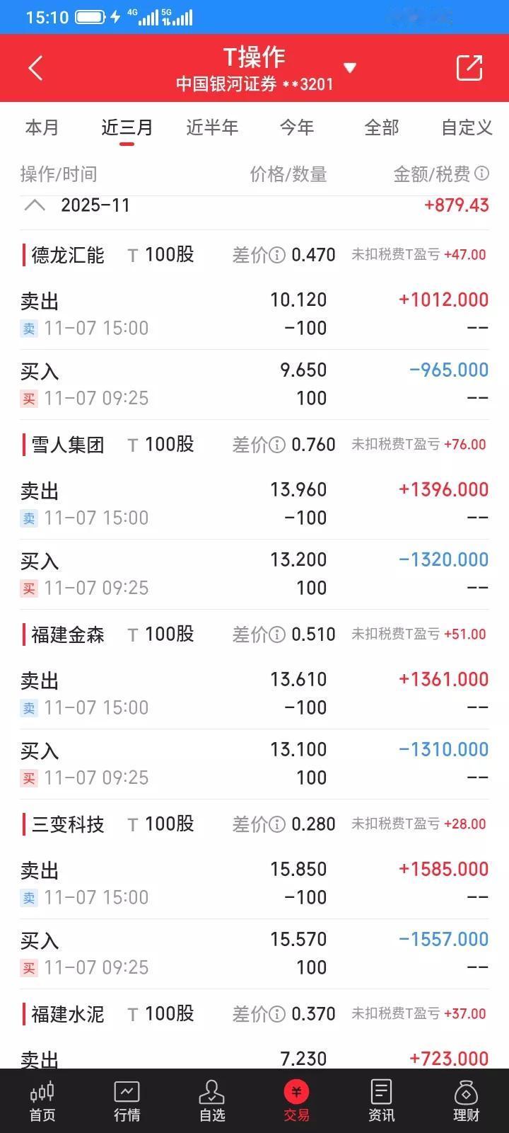 2025.11.07,今天t了5只股票,每只100股,都蒙对了,赚了239元,除掉印花税3块多,佣金1块多,净收益234元。
