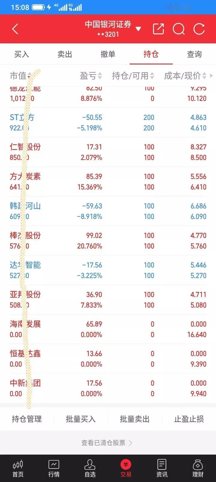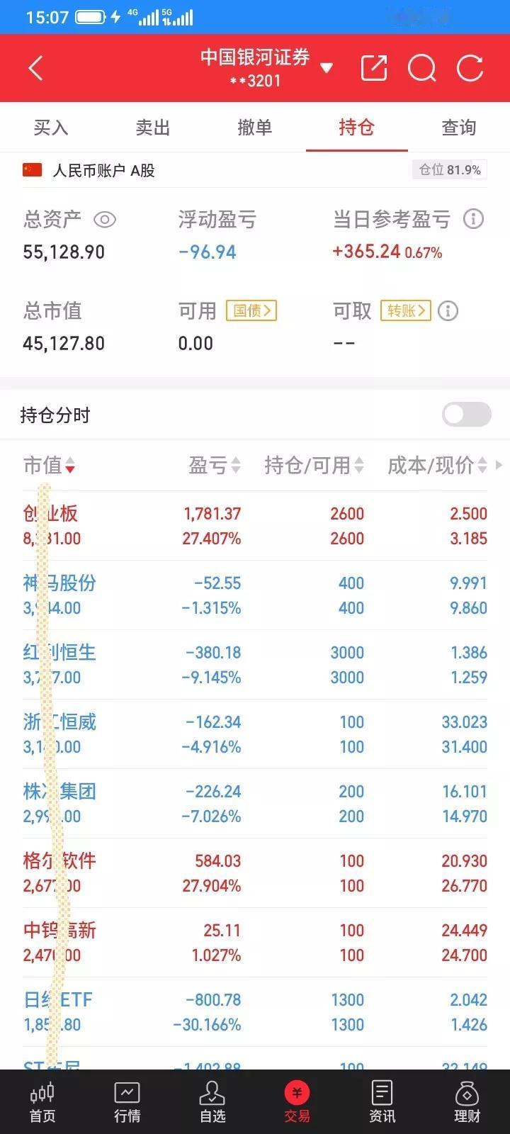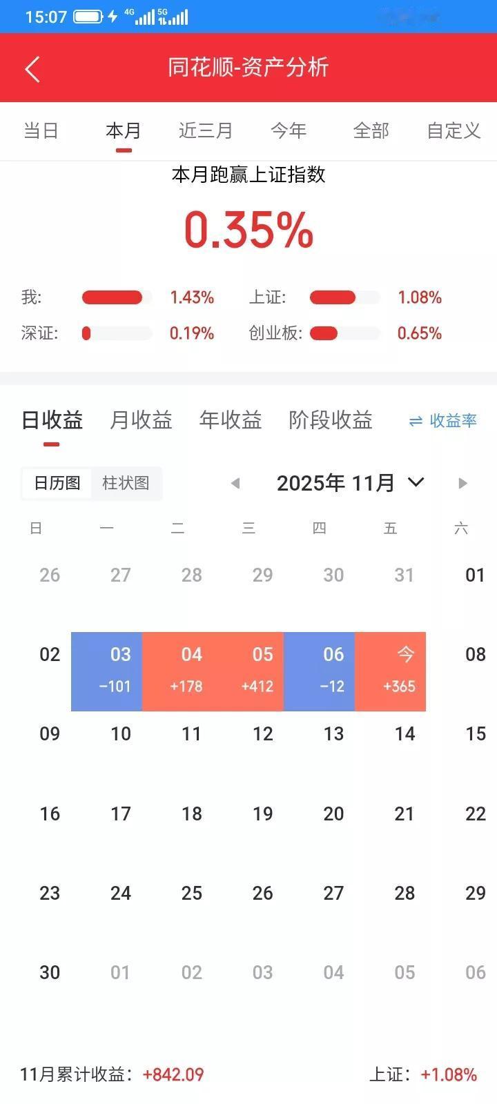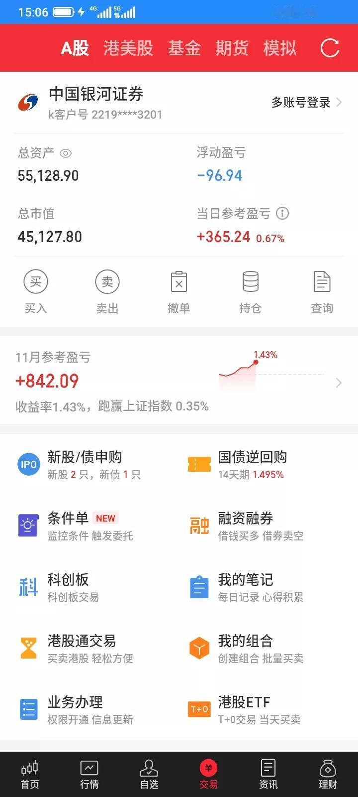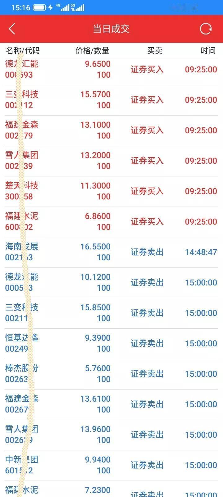 2025.11.07,今天上证指数微跌,我持有的股票涨跌各半。大部分都是冲高回落,坐了过山车,空高兴一场。今天海南发展早上大幅高开,很快封住涨停,几十万手封住涨停板,以为今天又稳了,浮盈一百多块钱,但是帅不过三秒,很快就破板了,一直幻想再次封板,舍不得卖,收盘前下跌到16.45元了,利润都快回撤完了,慌了,马上以16.55卖掉100股,触底反弹,成交了,成交之后又反弹上涨了,到收盘又少卖了十块钱,和涨停价比,少赚了80多块钱,最多赚150块钱,贪心了,离场最终才保住65块钱利润,赚钱就好,总比亏钱好。 今天雪人,格尔,都最最高冲到上涨9个多点,但是都差几分钱涨停,但是收盘都大幅回落下来了,又是诱多吧,太贪心,没有及时卖掉。还有几只股票都大幅反弹,但是收盘都跌回来了,错过了好的卖出时机。 今天早上想再买入一些股票,钱不够,又贷款了4000块,明天还掉,集合竞价,买入6只股票,以9.65买入100股德龙,最高冲到10.36元,收盘以10.12卖掉100股,赚47元。 以15.57买入100股三变,最低跌到15.15元,买贵了,最高冲高到15.95元,收盘以15.85卖掉100股,赚28元。 以13.10买入100股金森,最低跌到12.78,还是买贵了,触底反弹,最高冲到13.97元,收盘以13.61卖掉100股,赚51元。 以6.86买入100股福建水泥,接近最低价,最高冲到7.64元,收盘以7.23元卖掉100股,赚37元,卖晚了。 以13.20买入100股雪人,买在接近低价,最高冲到14.66元,收盘以13.96卖掉100股,赚76元,少卖了几十块钱。 以13.30买入100股楚天,这只股票买错了,收盘收在最低价附近,亏了24块钱。 收盘以5.76元减仓100股棒杰,今天冲高回落,先锁定部分利润,避免再跌下来又是白干了。 前几天买入的恒基,中新,也总是不大涨,收盘以9.94元把100股中新清仓了,赚17块钱,以9.39清仓了100股恒基,赚13块钱,买入股票就是希望它上涨,不上涨就及时卖掉算了,赚一点总比亏钱好。 其它的都波动不大,不适合交易,就都没有操作。东尼昨天反弹了一点点,今天还是跌下来了,昨天止损了100股,虽然卖在最低价,但是和今天收盘比起来,还是卖对了,少亏了10块钱。 今天总体新建仓一只股票,清仓3只股票,减仓1只股票,t了5只股票,每只t了100股,做t赚到239元,印花税3块多,佣金1块多,净赚230多块钱,也好,当做了一天日结。 今天总市值4.51万元,总资产5.51万元,今天总体账户反弹回本364元。股大盘指数 上证收益指数 海南股票 海南公司 海南经济 海南公司价值