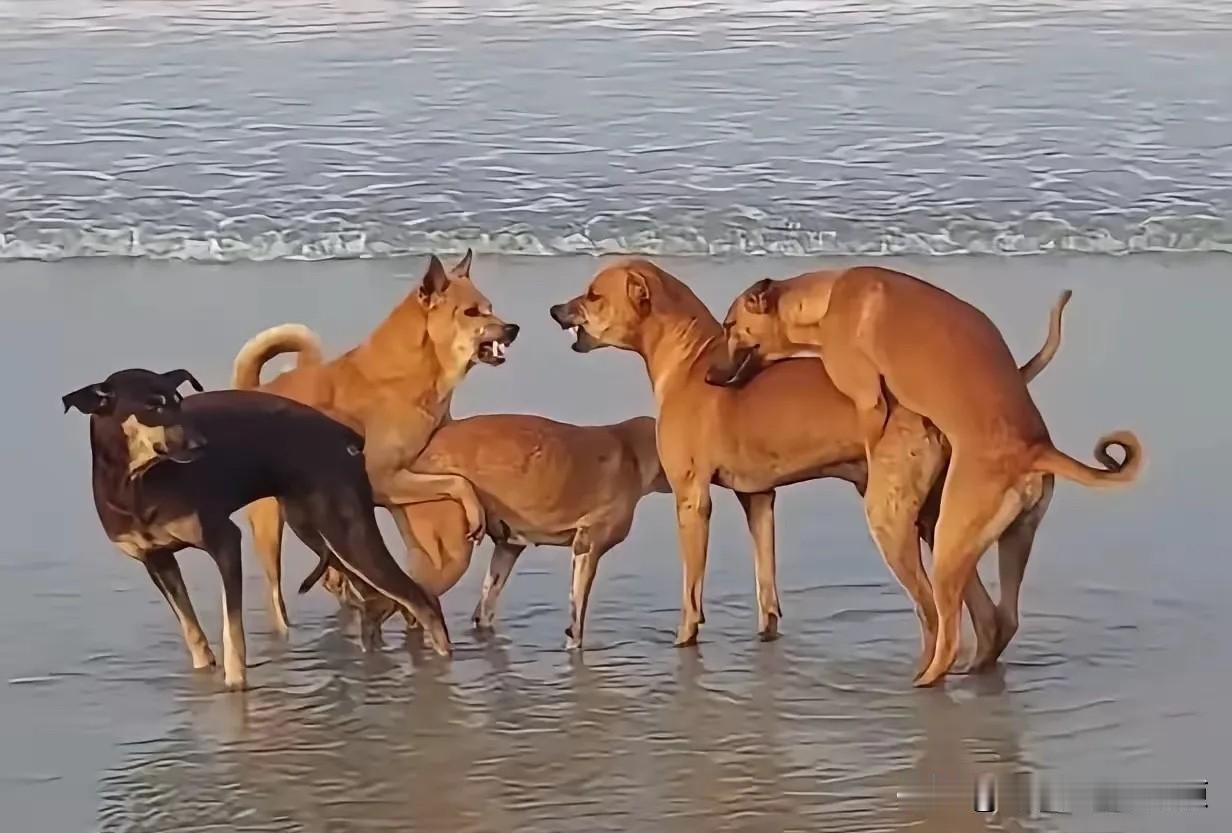 狗狗的快乐就是这么简单! 不过,貌似那只阿黄有点痛苦啊。 凭什么大家都是出来耍的? 凭什么你们都有伴? 就只剩那阿黄只能看着你们秀恩爱? 不管了,小黑,你给我离开,把你的位置让给我。