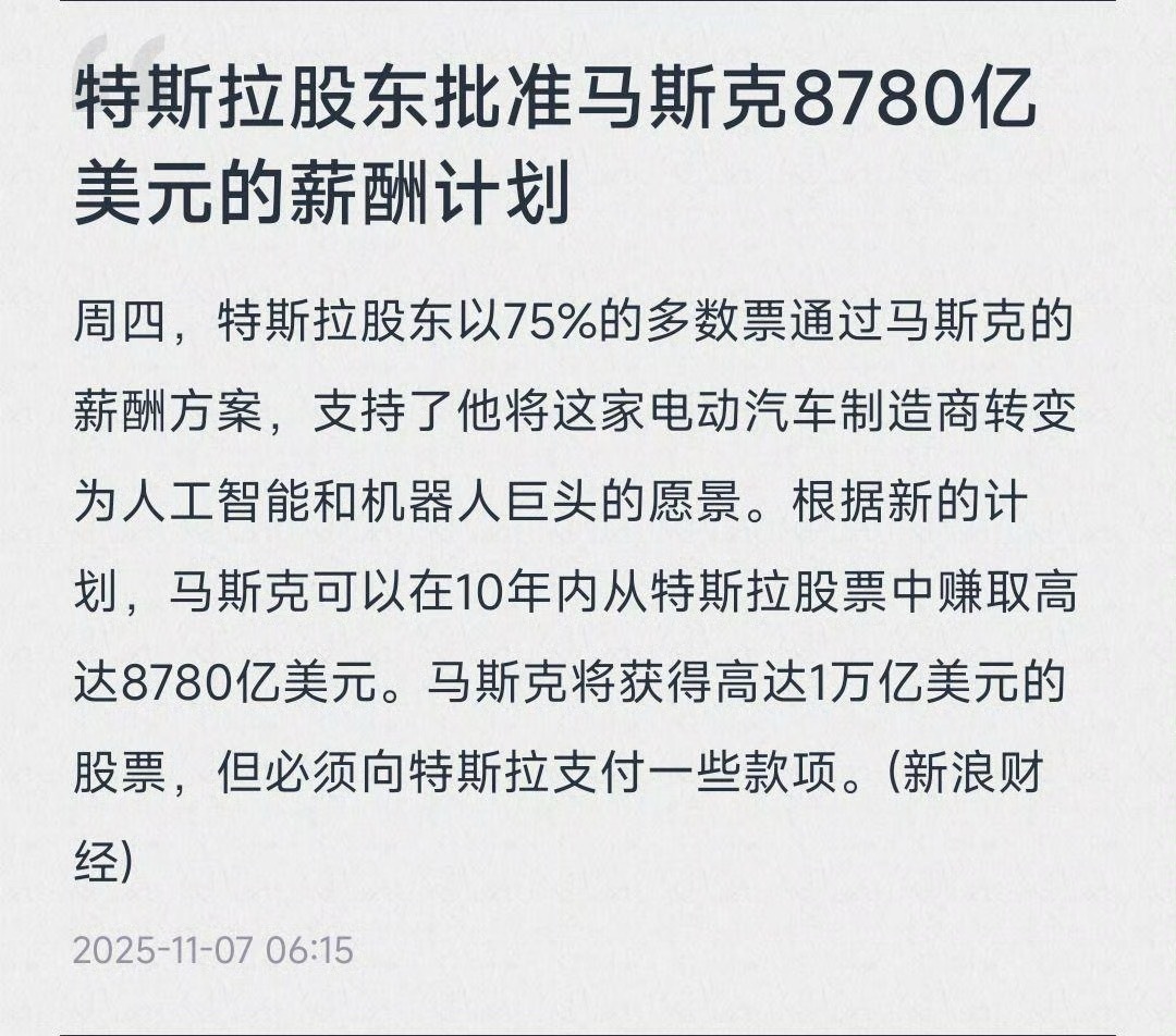 特斯拉股东以75%的多数票通过马斯克价值1万亿美元的薪酬方案!马斯克天价薪酬方案通过 马斯克就万亿美元薪酬获批发声 马斯克和机器人斗舞