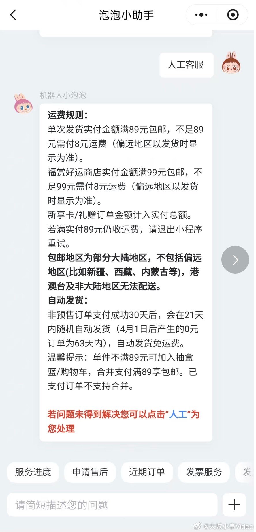 就挂链也要满89元包邮一事,泡泡玛特客服回应称,这是正常的包邮条件,客户也能选取16元至19元的商品就79元挂链进行凑单,实付95元至98元正常会比包邮89元多了6至9元。此外,259元挂饰为手工编绳,可以当作手链或挂链挂在包包上。该挂饰是根据IP授权,商品工艺和材质方面进行定价的,由相关部门负责,后续是否会调整相关定价要核实等通知。