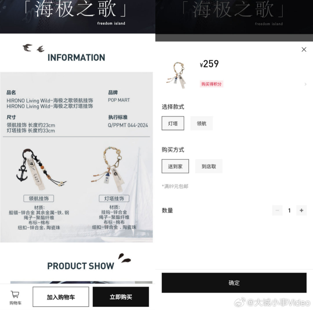 登陆泡泡玛特官方小程序搜索“挂饰”发现,泡泡玛特挂饰定价在29元至259元一条不等。其中259元“海极之歌”挂饰材质主要由锌合金、聚酯纤维、棉布和陶瓷珠组成。挂饰也需满足89元包邮条件,若下单79元dimoo挂链盲盒,不足89元需支付8元运费。