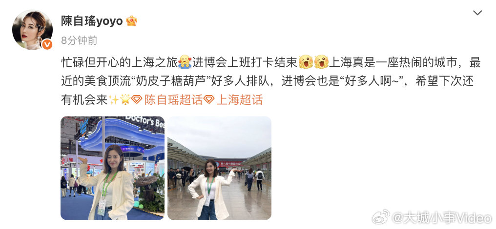 “忙碌但开心的上海之旅,进博会上班打卡结束,上海真是一座热闹的城市,最近的美食顶流“奶皮子糖葫芦”好多人排队,进博会也是“好多人啊~”,希望下次还有机会来!”