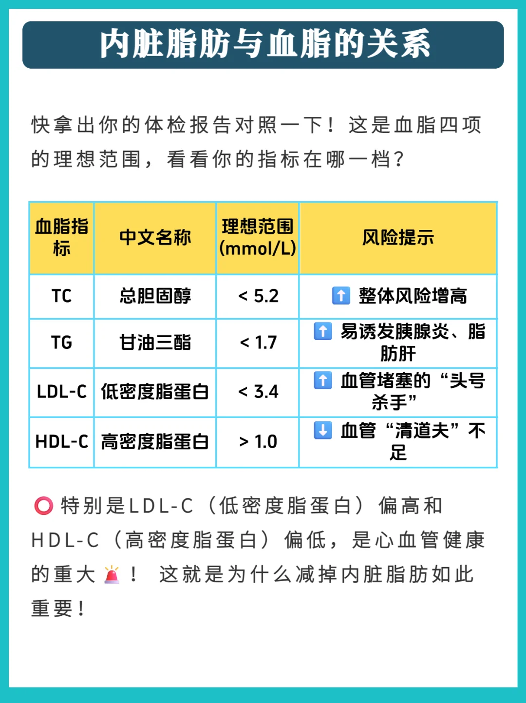 内脏脂肪是个“捣蛋鬼”,它会扰乱肝脏代谢,让你的血脂四项指标全面告急!快拿出体检报告对一对如果出现以下数字那就要小心了: